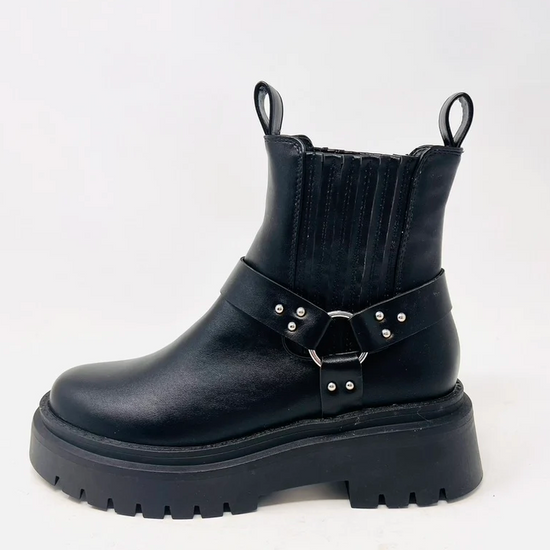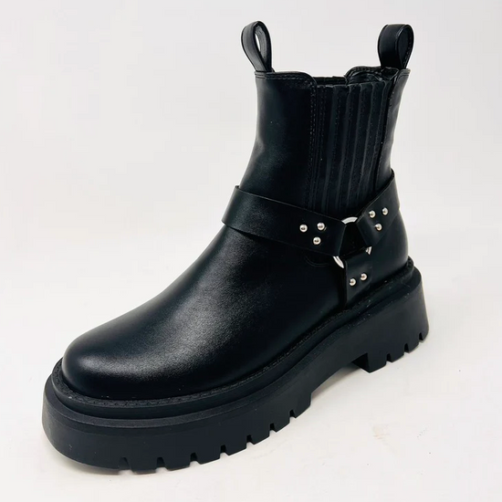 Fenner by Billini is a combat boot with pull tabs for easy wear detailed with biker-like hardware and textured stack heels that offer perfect traction and grip.