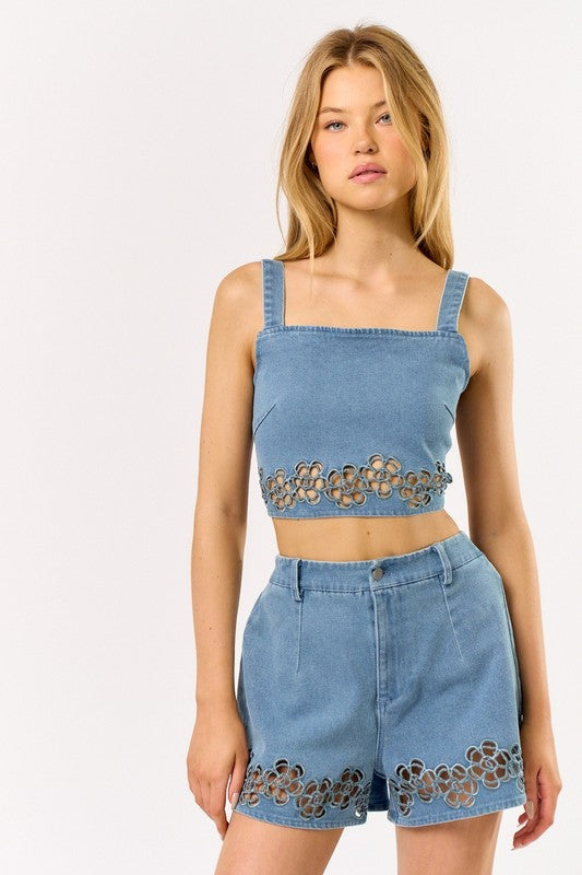 A denim lovers dream! Add a touch of charm to your typical denim set. This short set features a delicate embroidery for a feminine edge. Top is cropped with a square neckline and elastic back, while the matching shorts keep it laid back.