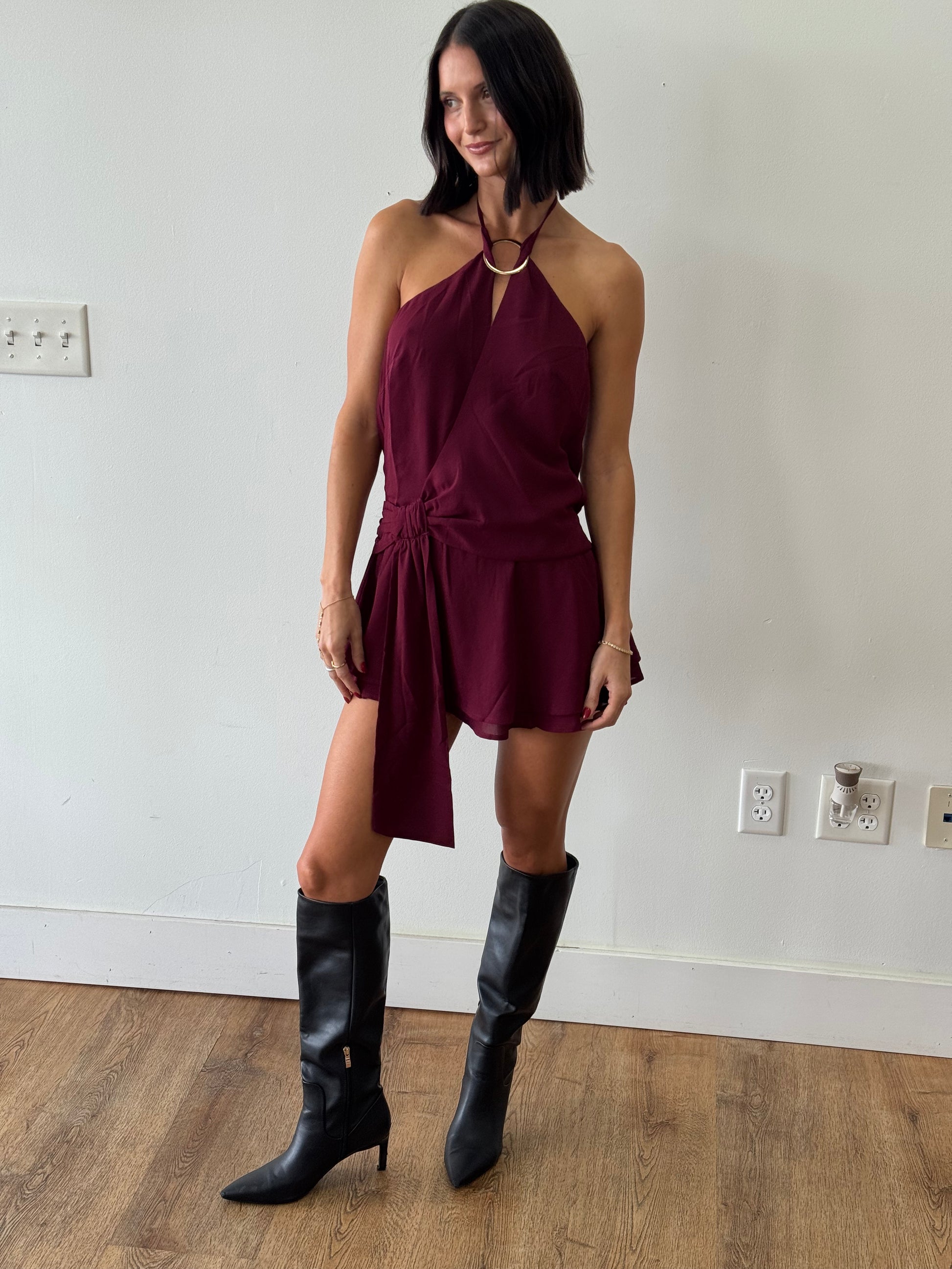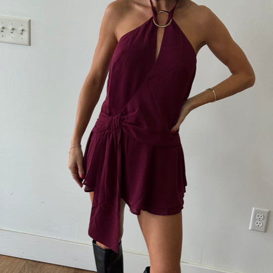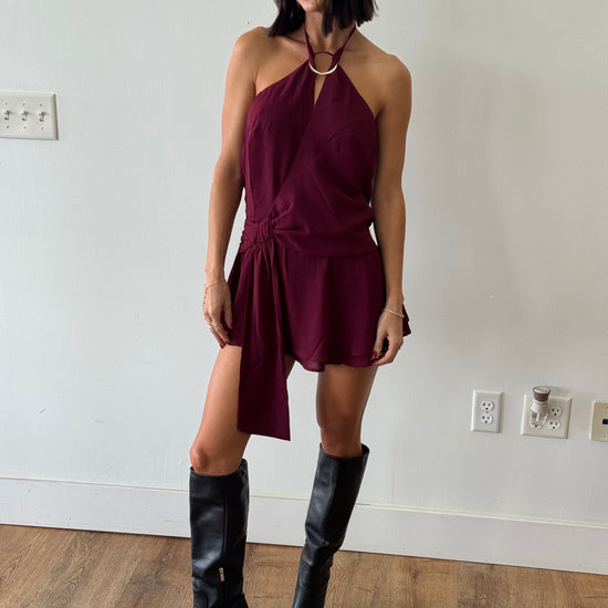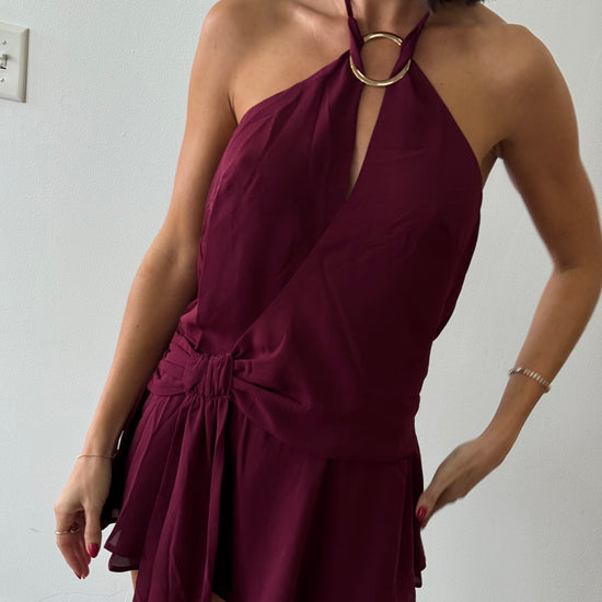 Mini halter dress with a cinched waist. Open back with tie detail. Gold ring detail is detachable.