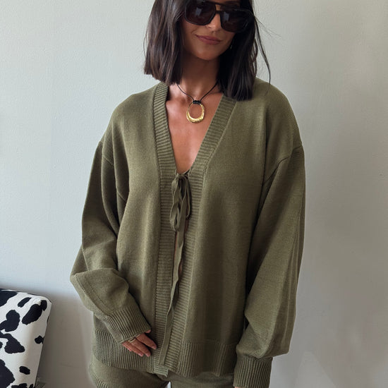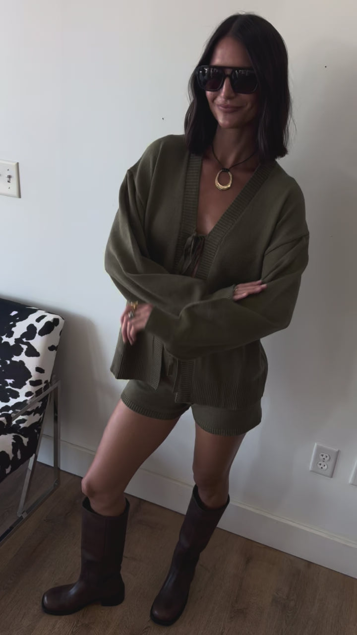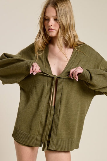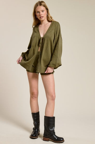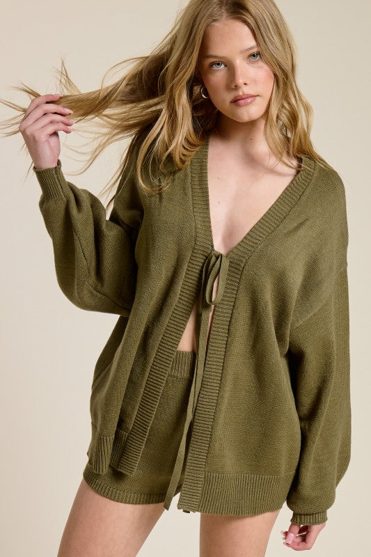 A knit cardigan and shorts set, perfect for lounging or running errands. The oversized cardigan features ribbed sleeve cuffs and hem, a slouchy fit, with a center self-tie ribbon closure for a stylish touch. The matching shorts have a ribbed high-waisted elasticized waistband, ribbed hems, and a fitted silhouette.