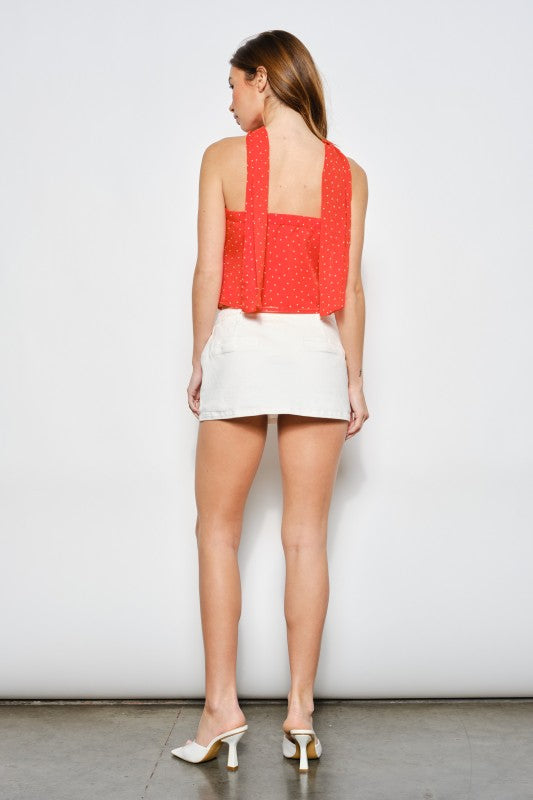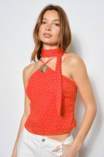 A little coastal, a little spicy. This halter top features a flattering fit, dainty polka dots, and the cutest shell detail front and center. Comes with a detachable neck scarf so you can switch up the vibe—wear it your way from beach days to bar nights ✨