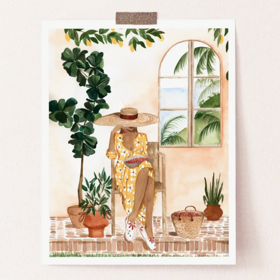 Travel to Croatia in this painting by Sabina Fenn. The botanical and peach hues are the perfect addition to brighten up any space! Prints are packaged in a biodegradable clear cellophane-style sleeve and protected by a rigid back board for display sturdiness. Prints are unframed.