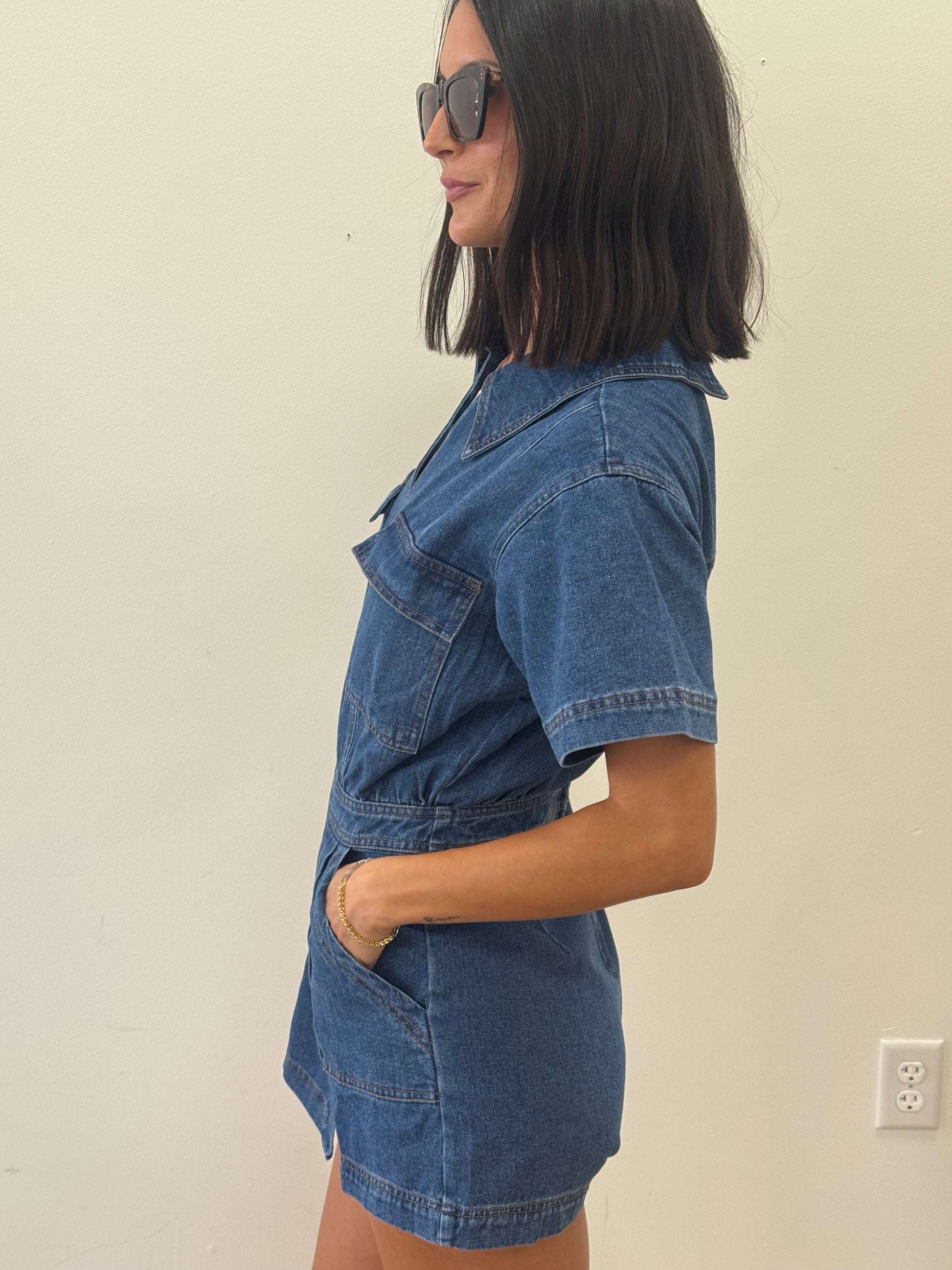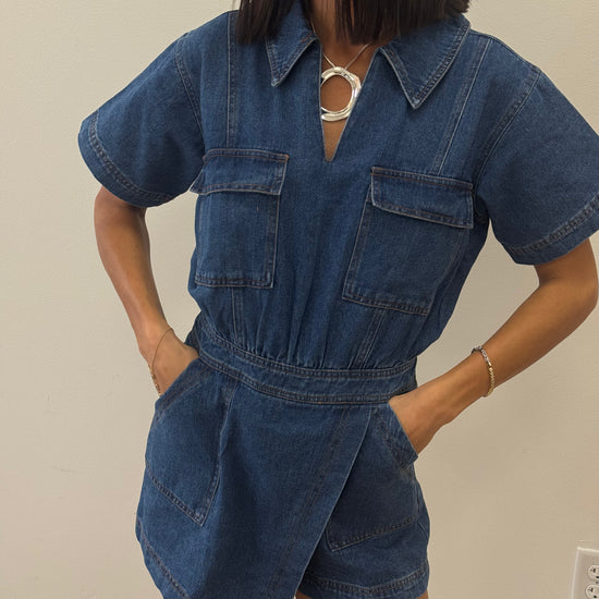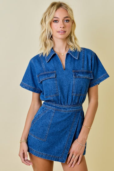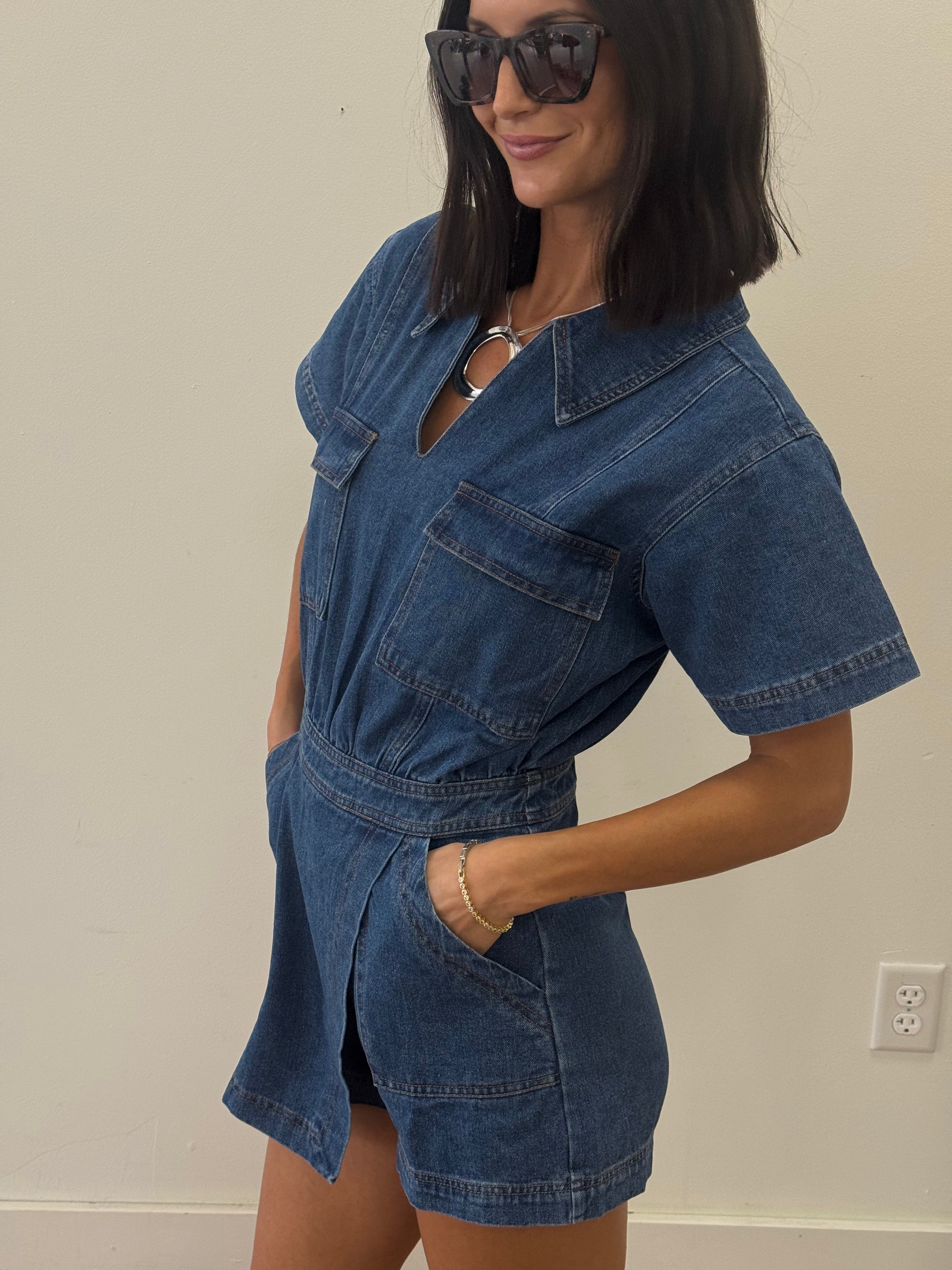 This denim romper with the asymmetrical skirt hem is the perfect denim piece transferring into fall. Perfect for game days, concerts and day dates!