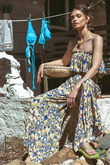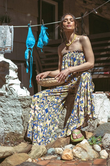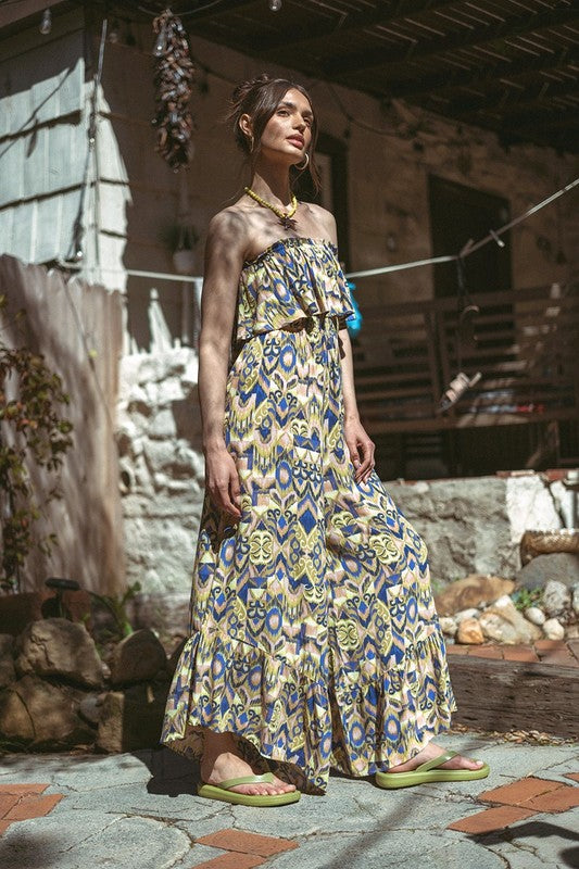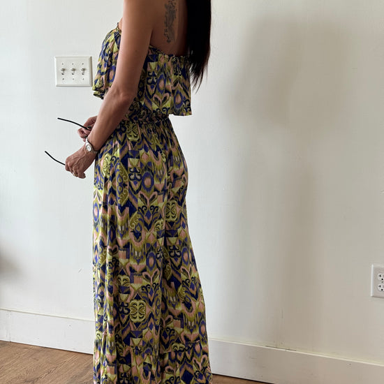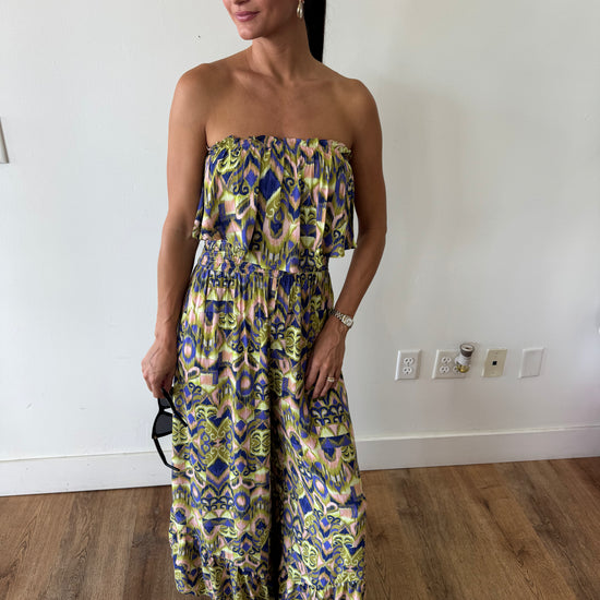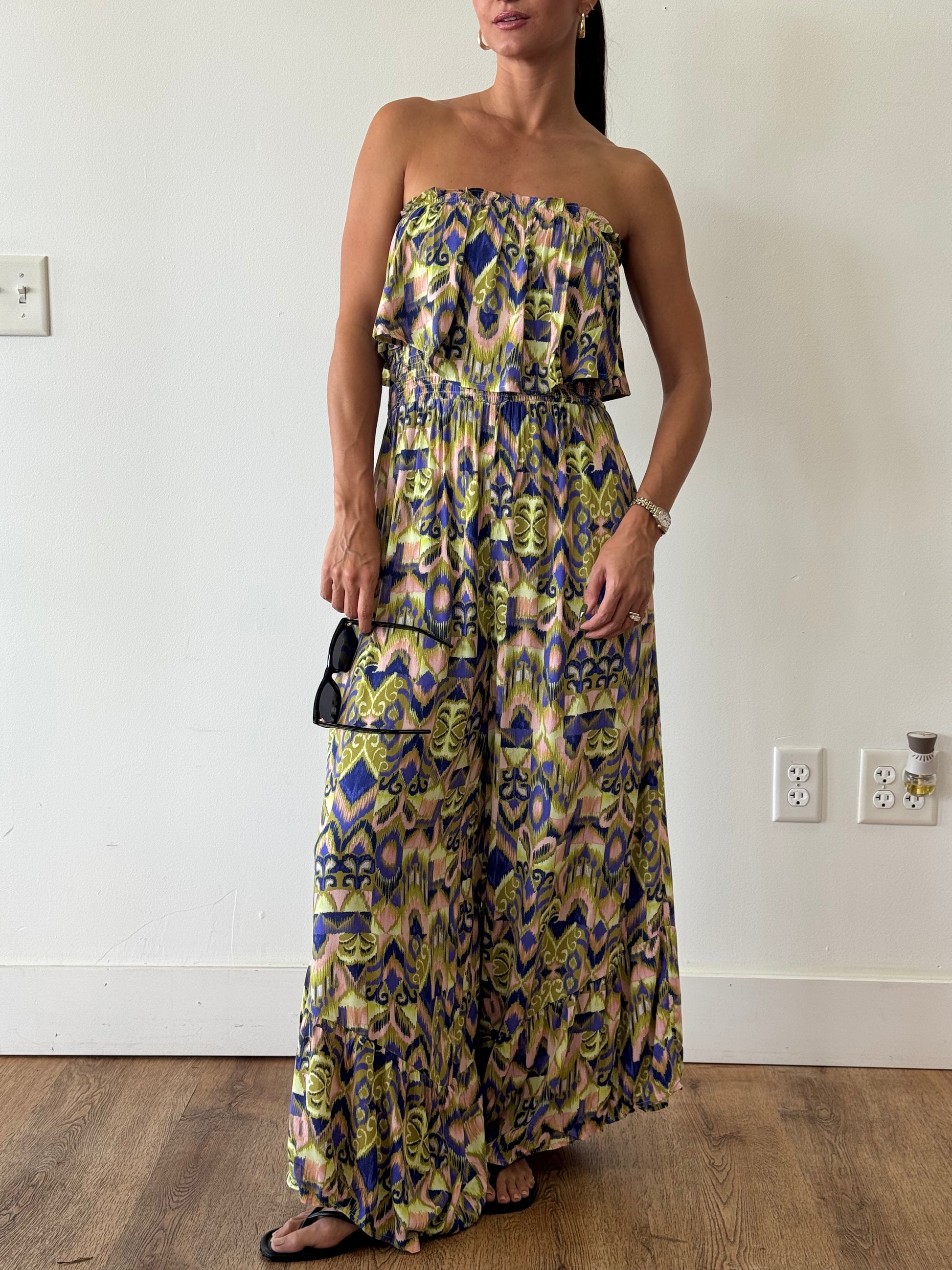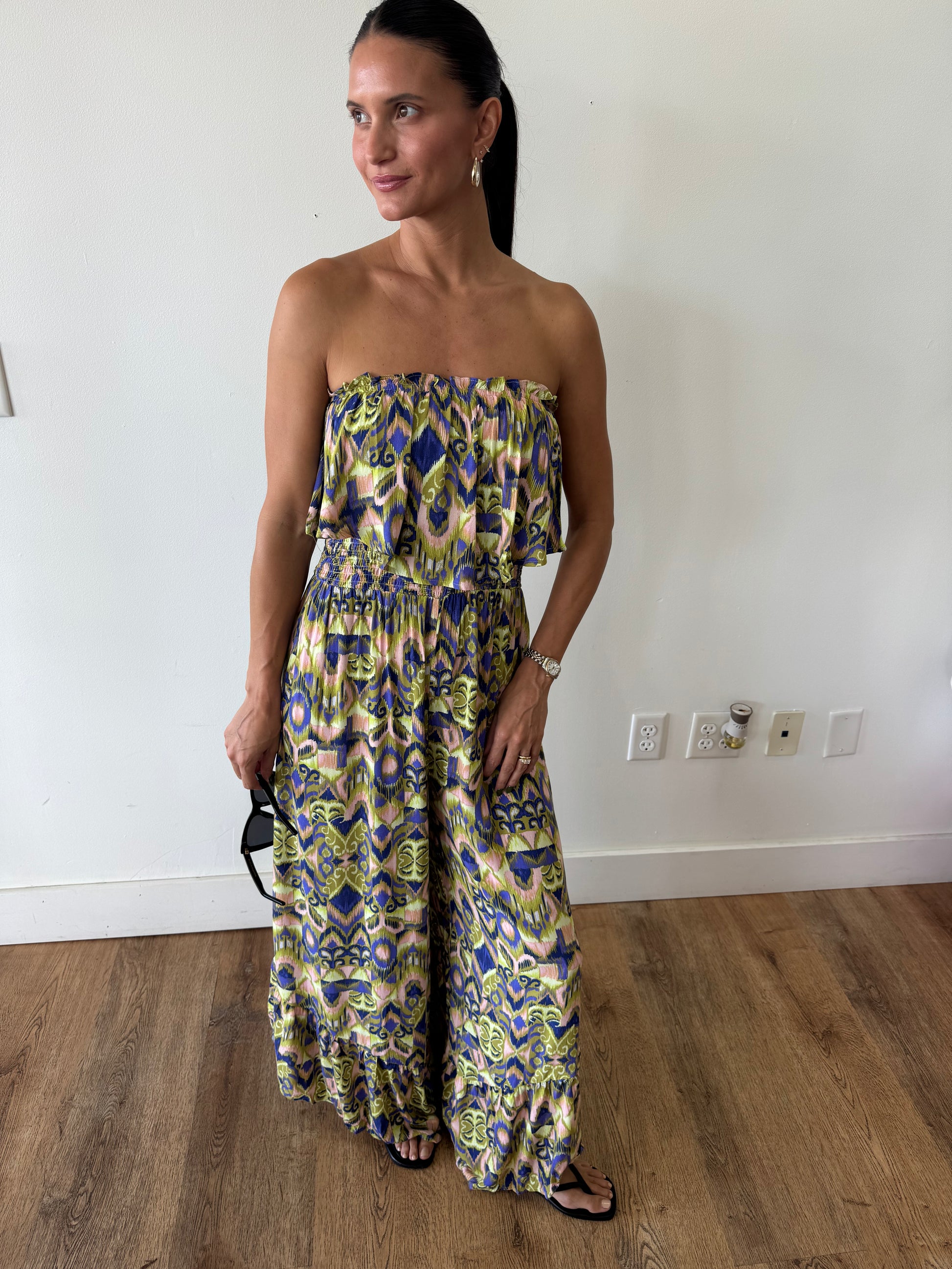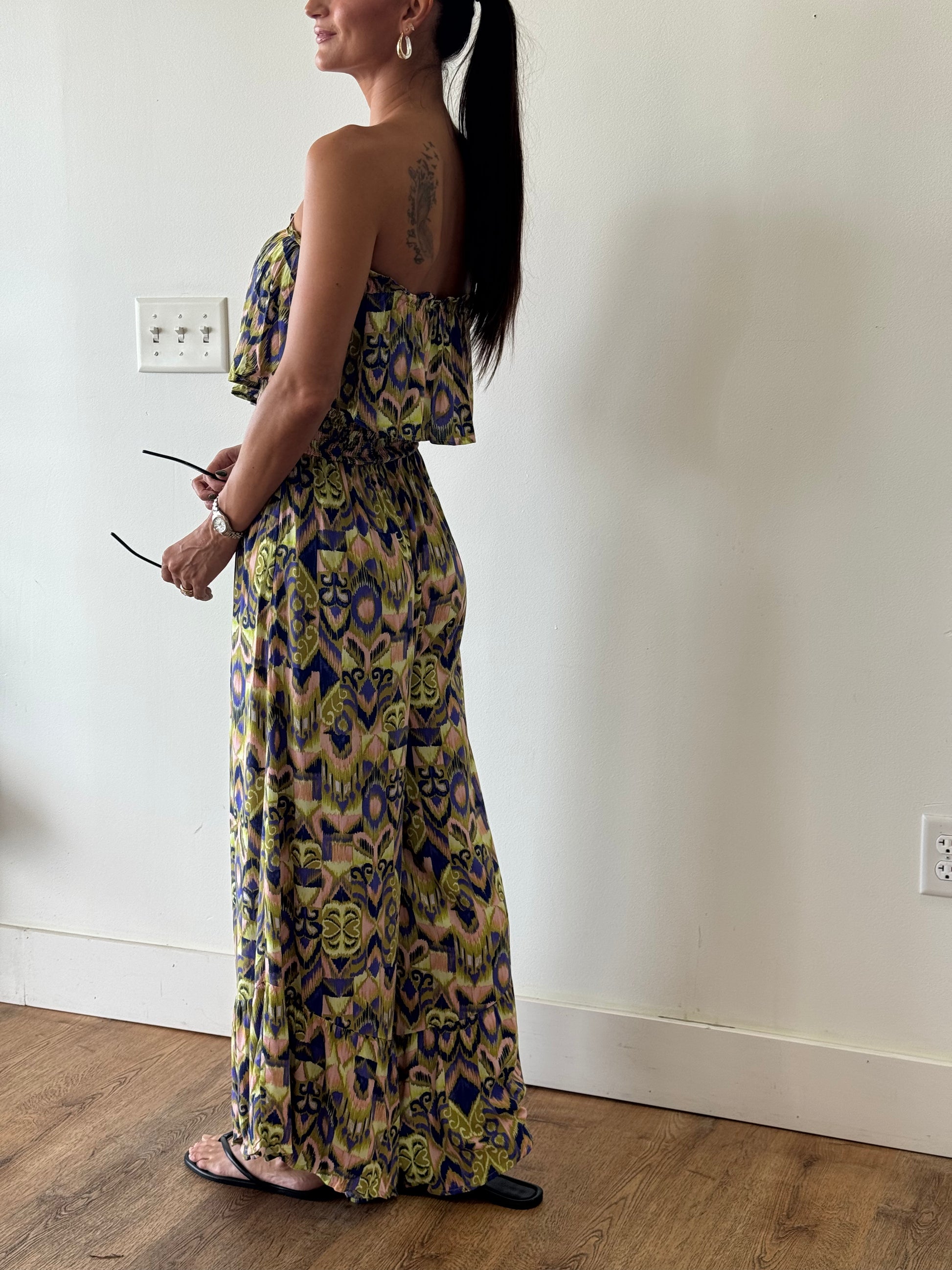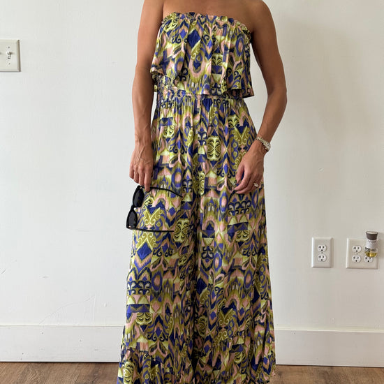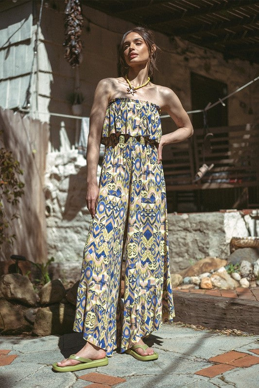 Tall girl approved! Tube jumpsuit, wide legs, ruched bodice, ruffle detail, fun/ aztec-y print.