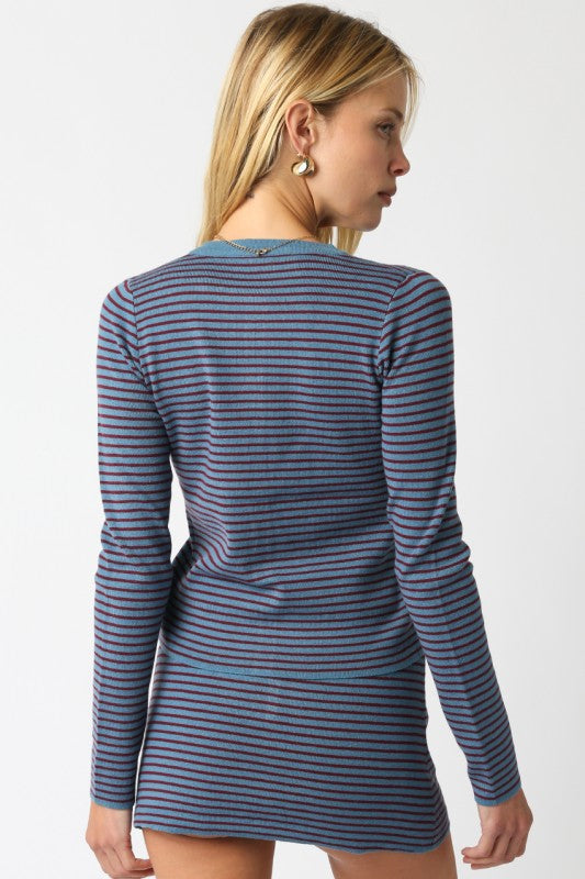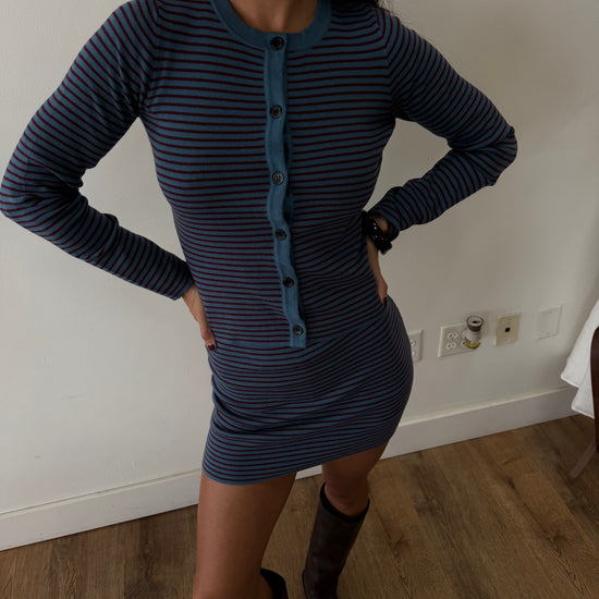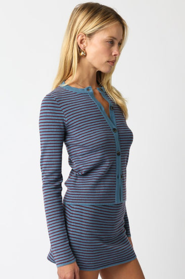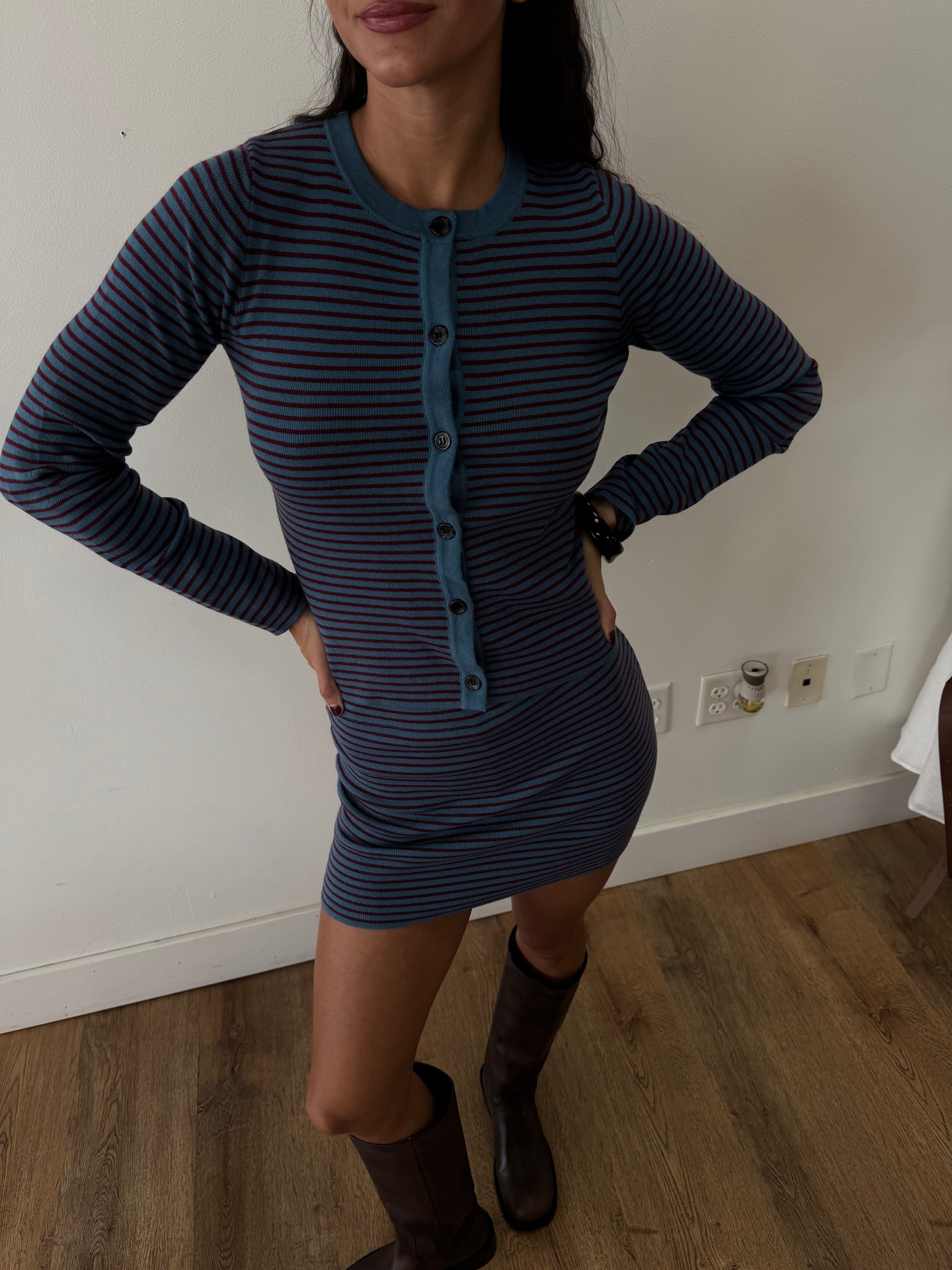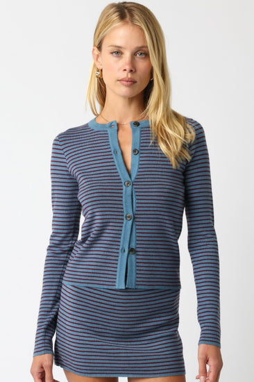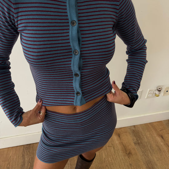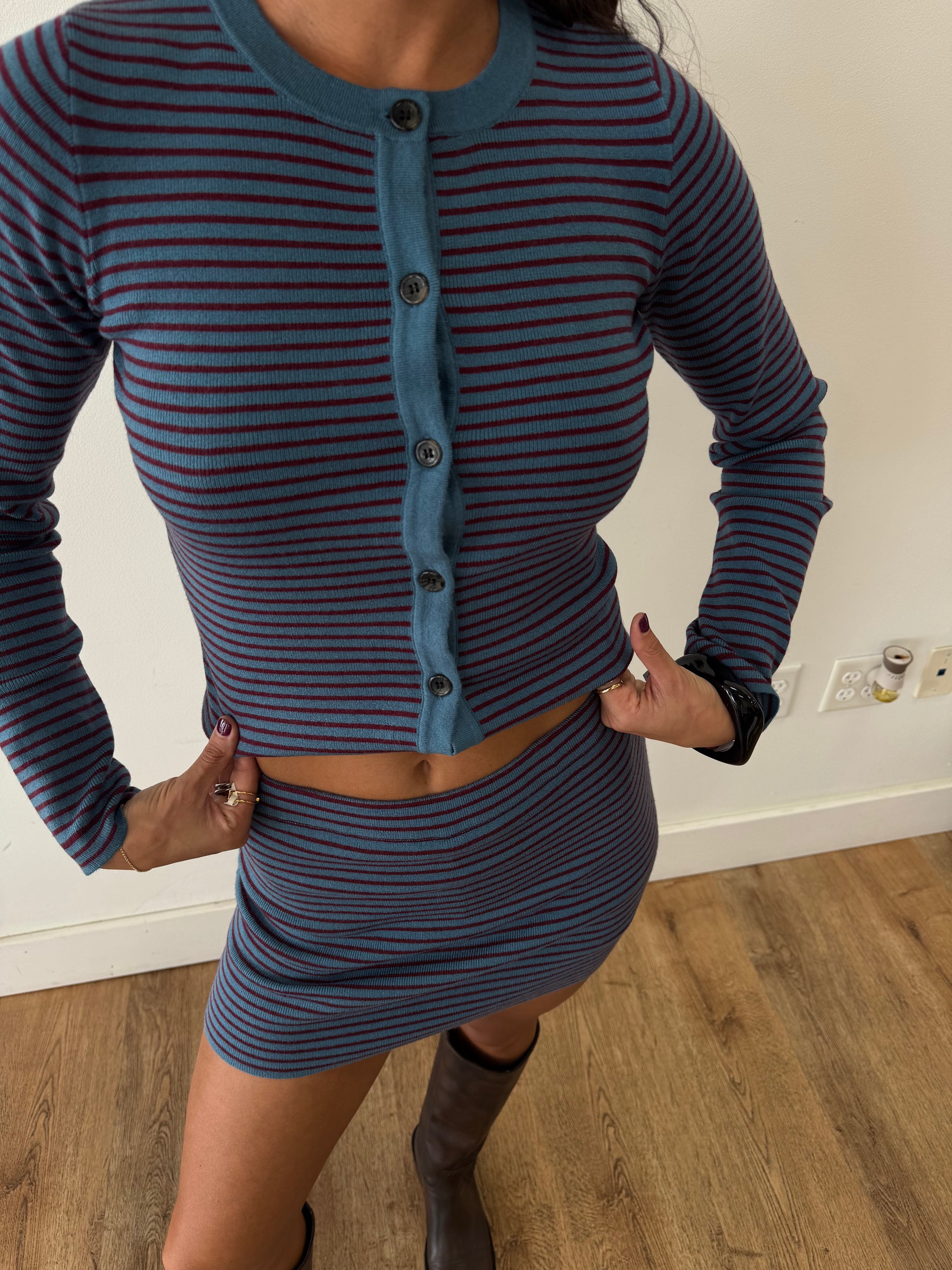 Matching cardigan and skirt set detailed in the most perfect blue/red combo striped. Cardigan has working buttons and skirt is a slip on with built in shorts! Sold as a set.