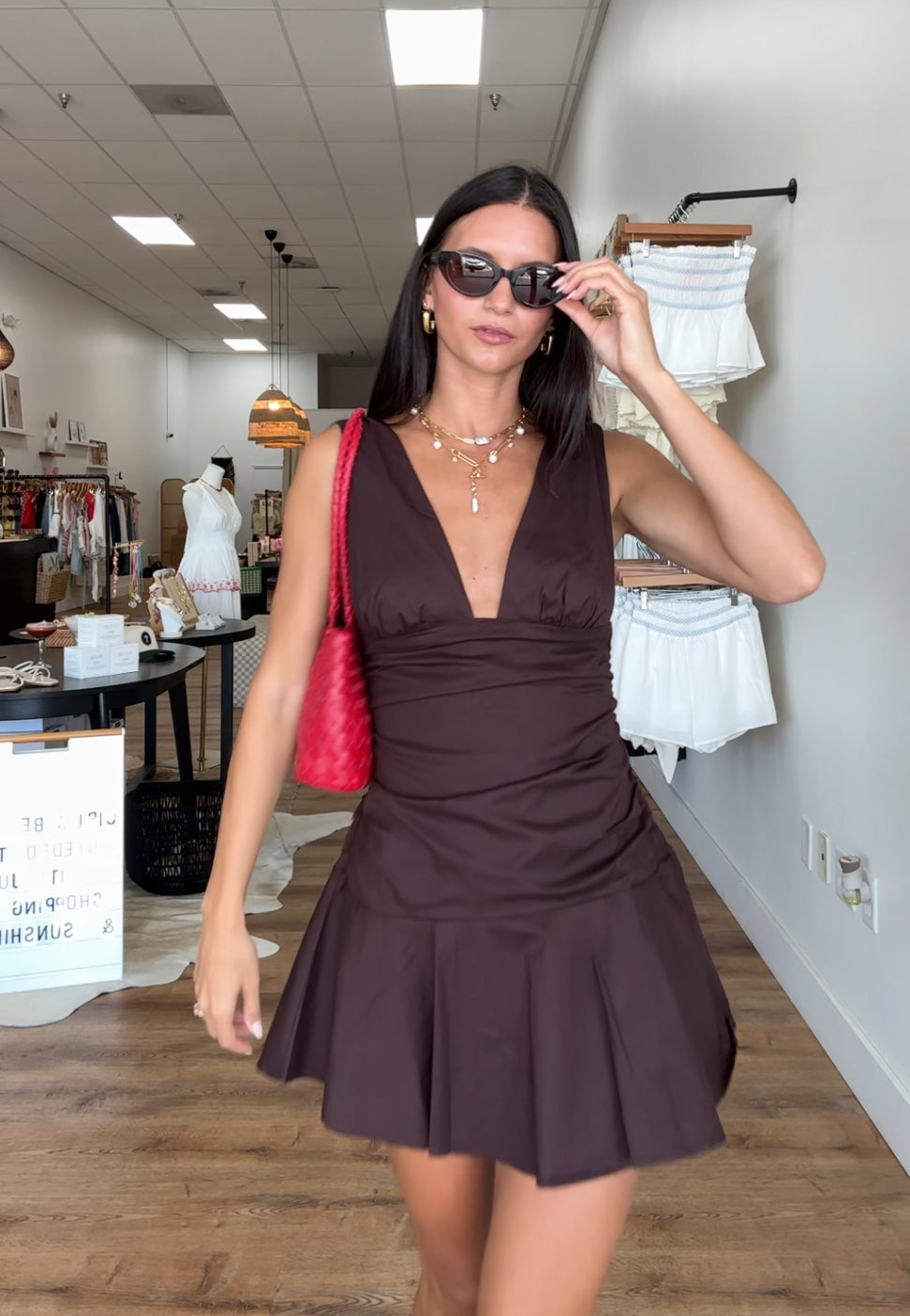 Stunner!! This deep v neck mini is detailed with a ruched drop waist to fit and flare skirt. Hidden side zipper.