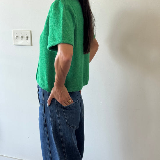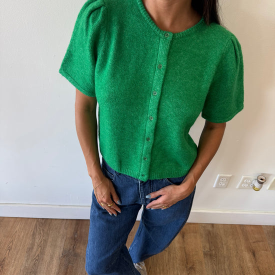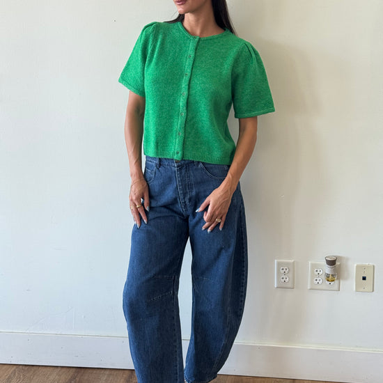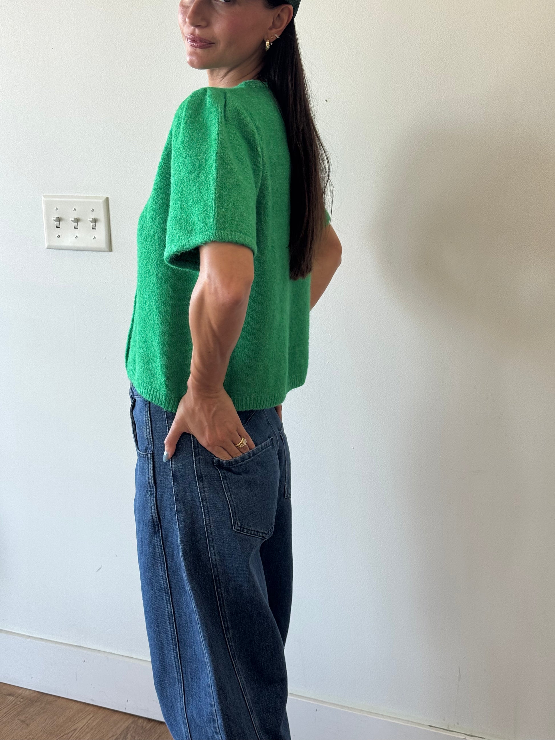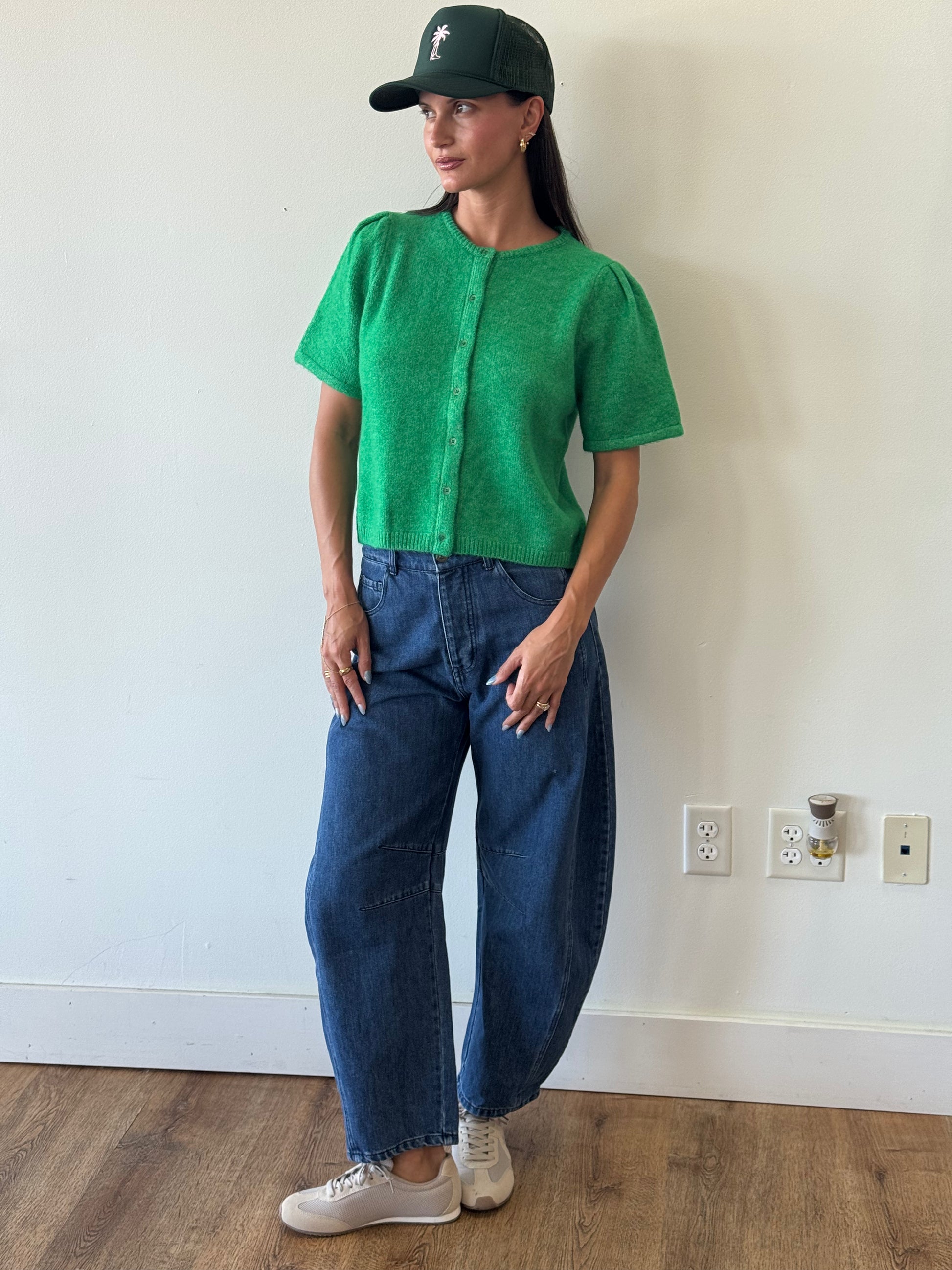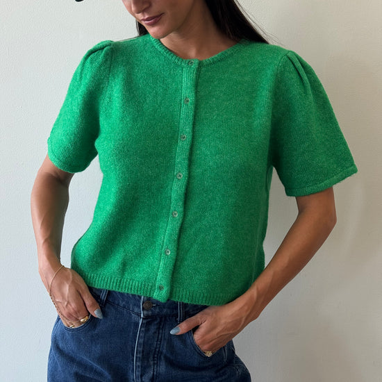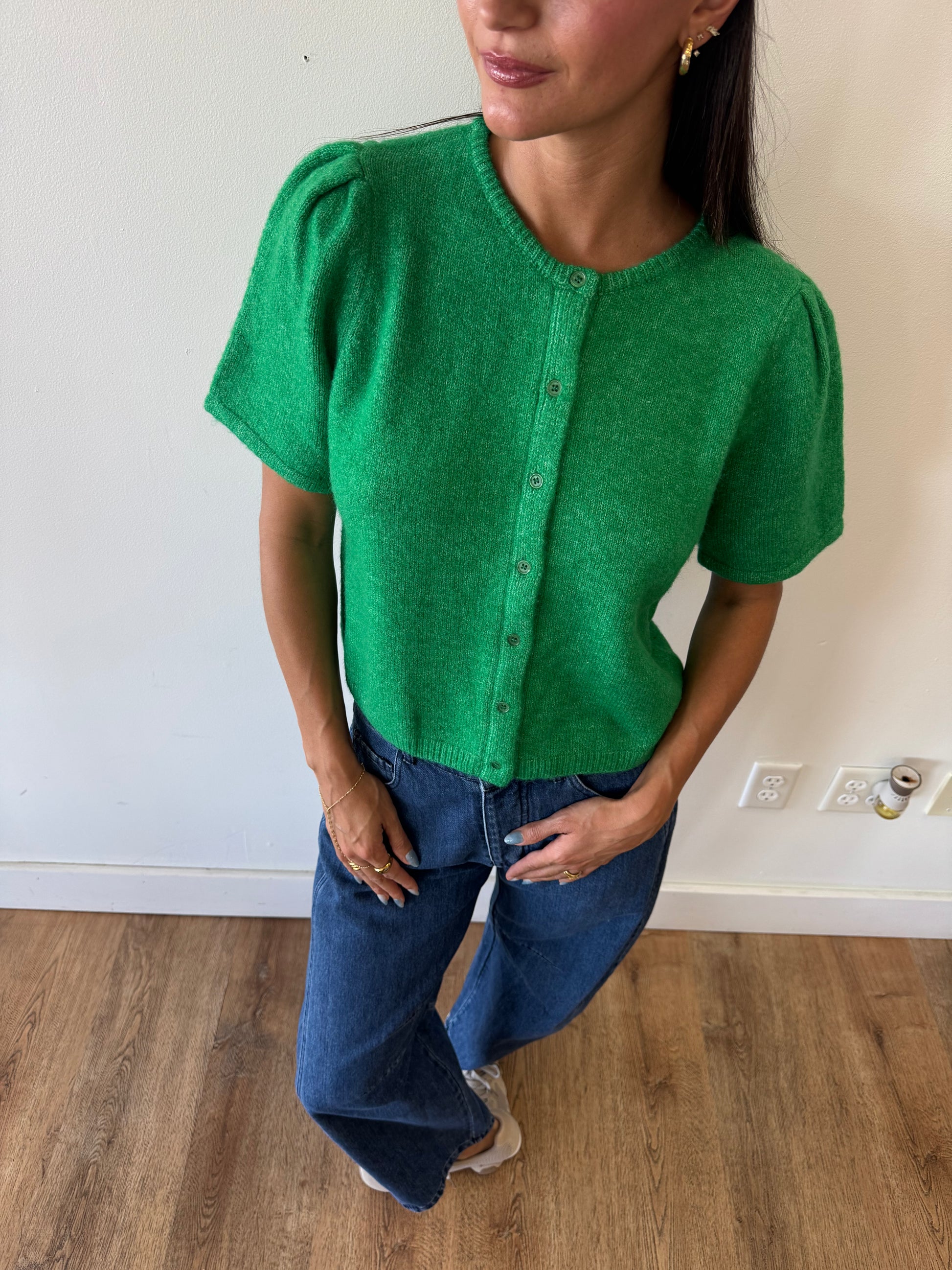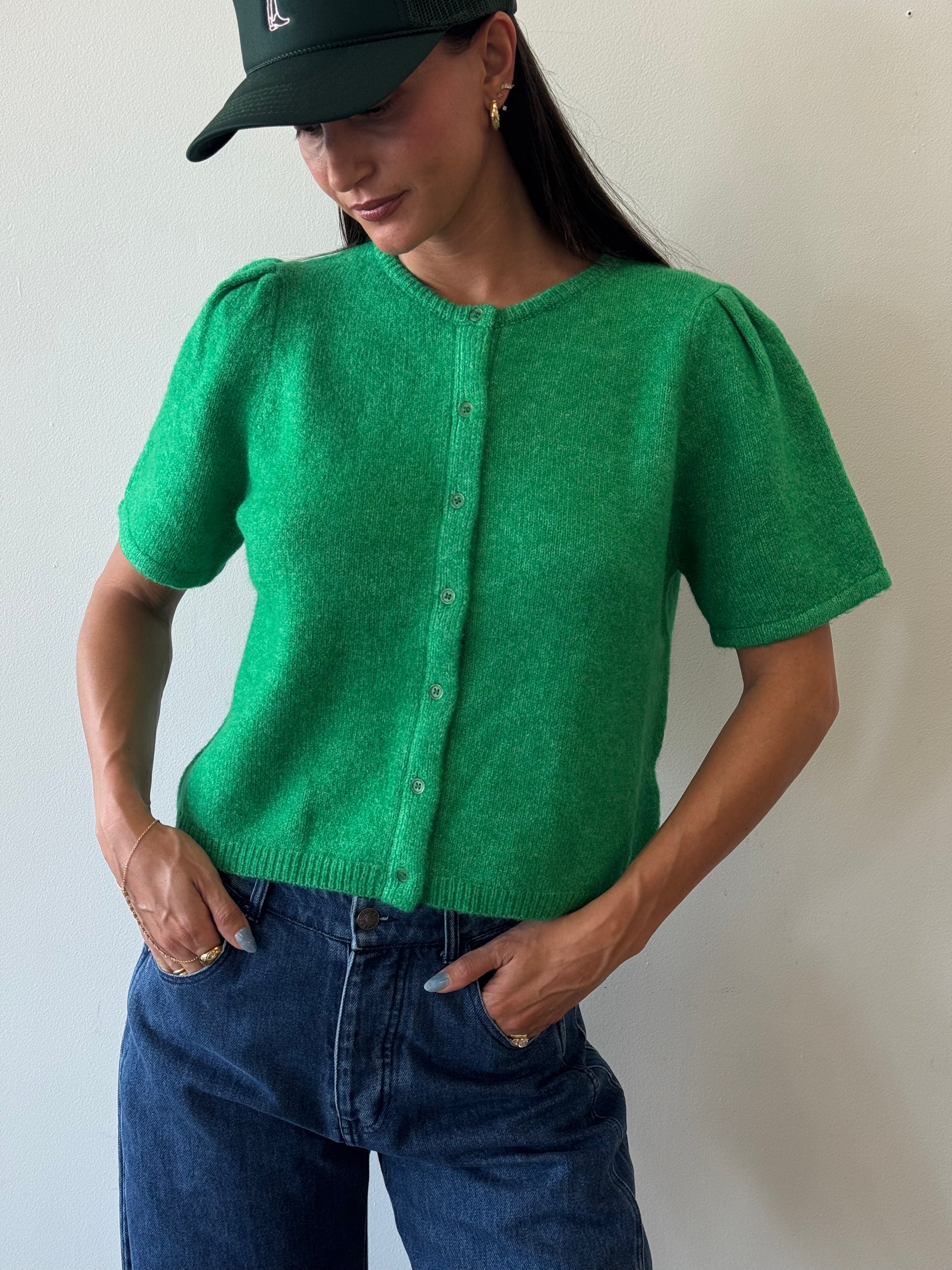 Short puff sleeve cardigan. Working buttons. Buttery soft. Ribbed neckline and hem. Relaxed fit.