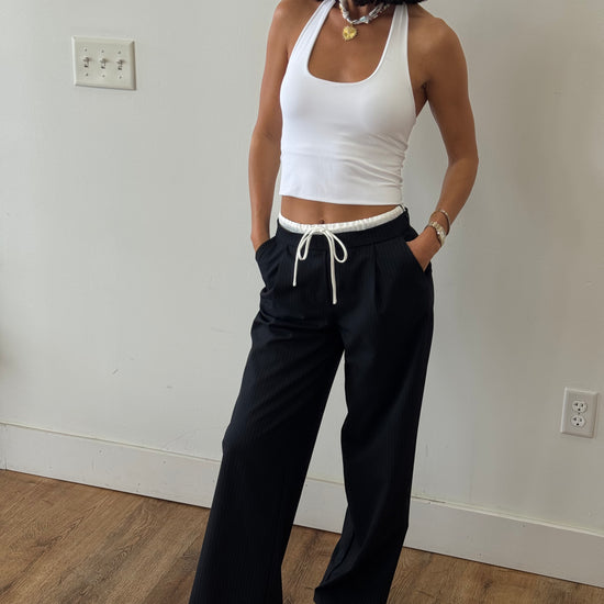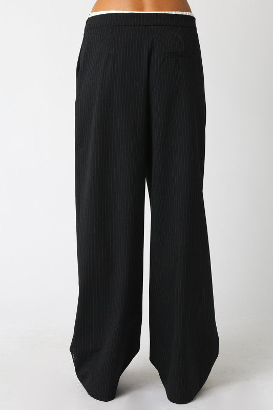 Pinstripe trousers with waistband detail. Effortlessly cool without even trying. Side zipper.