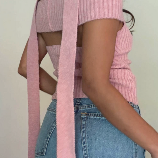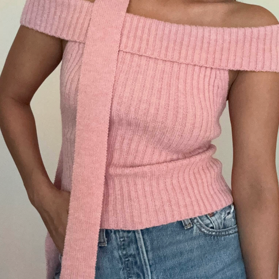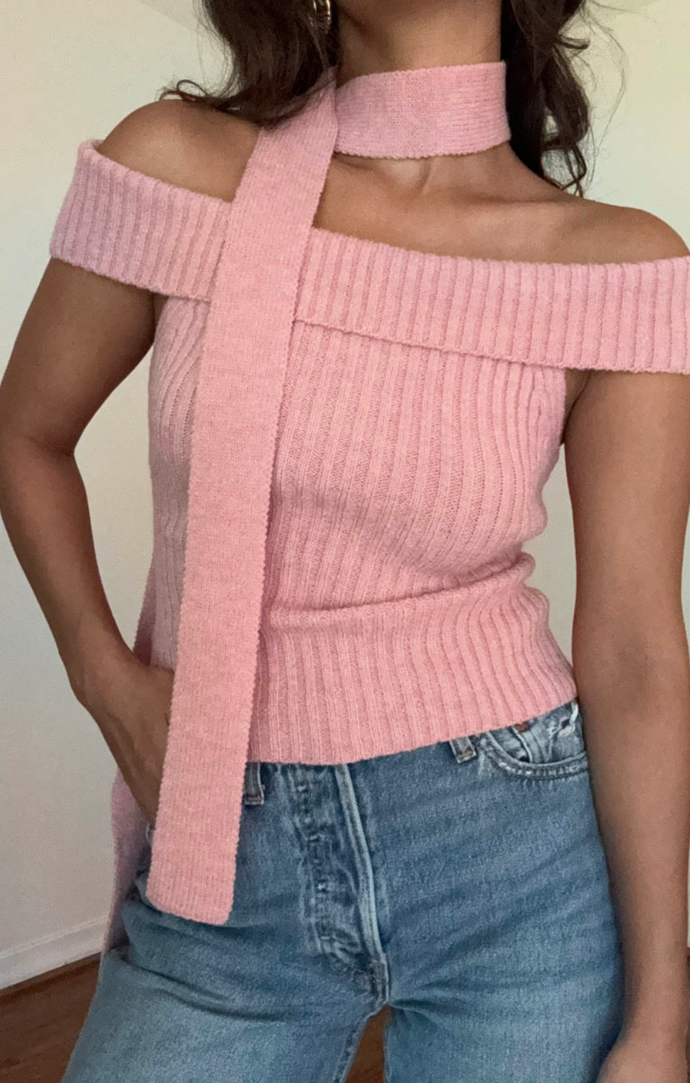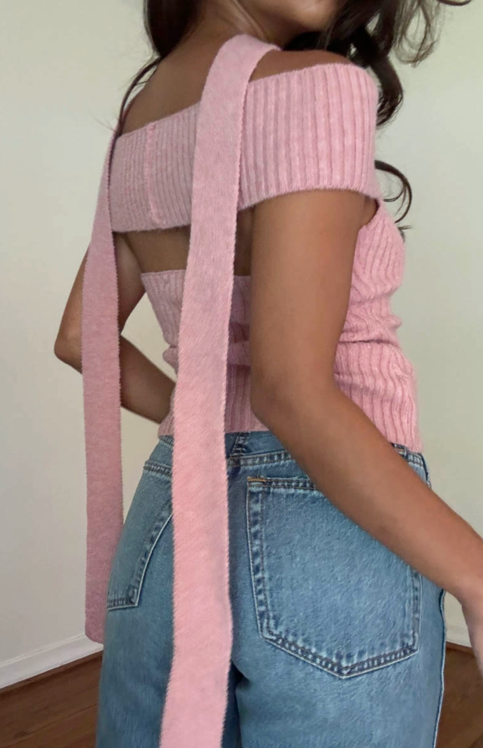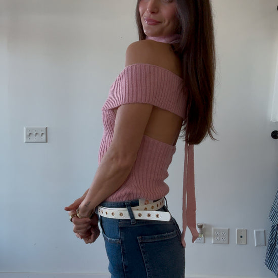 This off-the-shoulder sweater top is so cute for transitioning into spring. The neck tie is removable! Wear her around your neck, as a belt or in your hair! options options options.