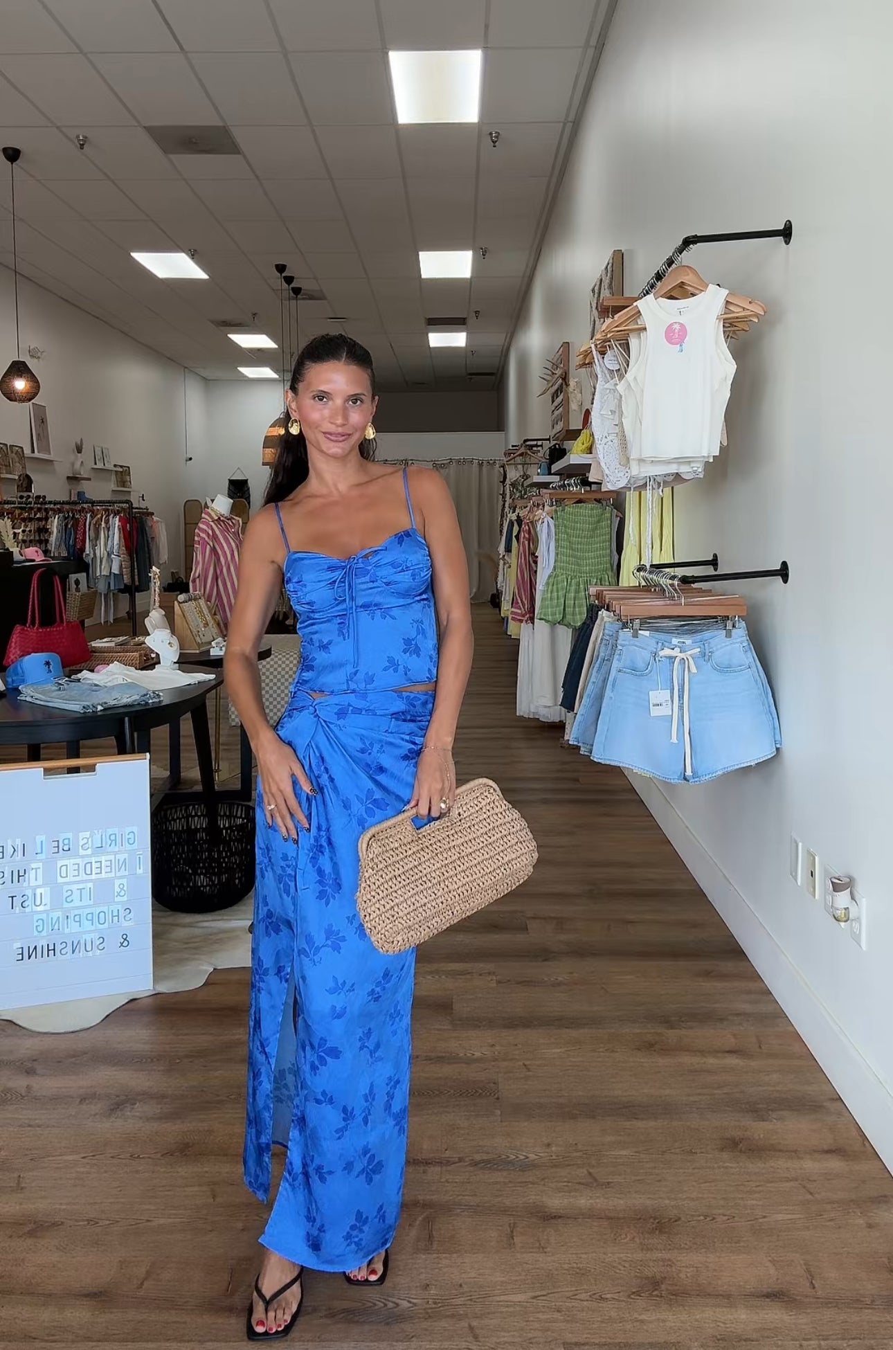 Stunner!! A royal blue set with floral detail all over. Top is corset style with adjustable spaghetti straps and side zipper. Sarong style skirt with zipper and side slit! Sold together.