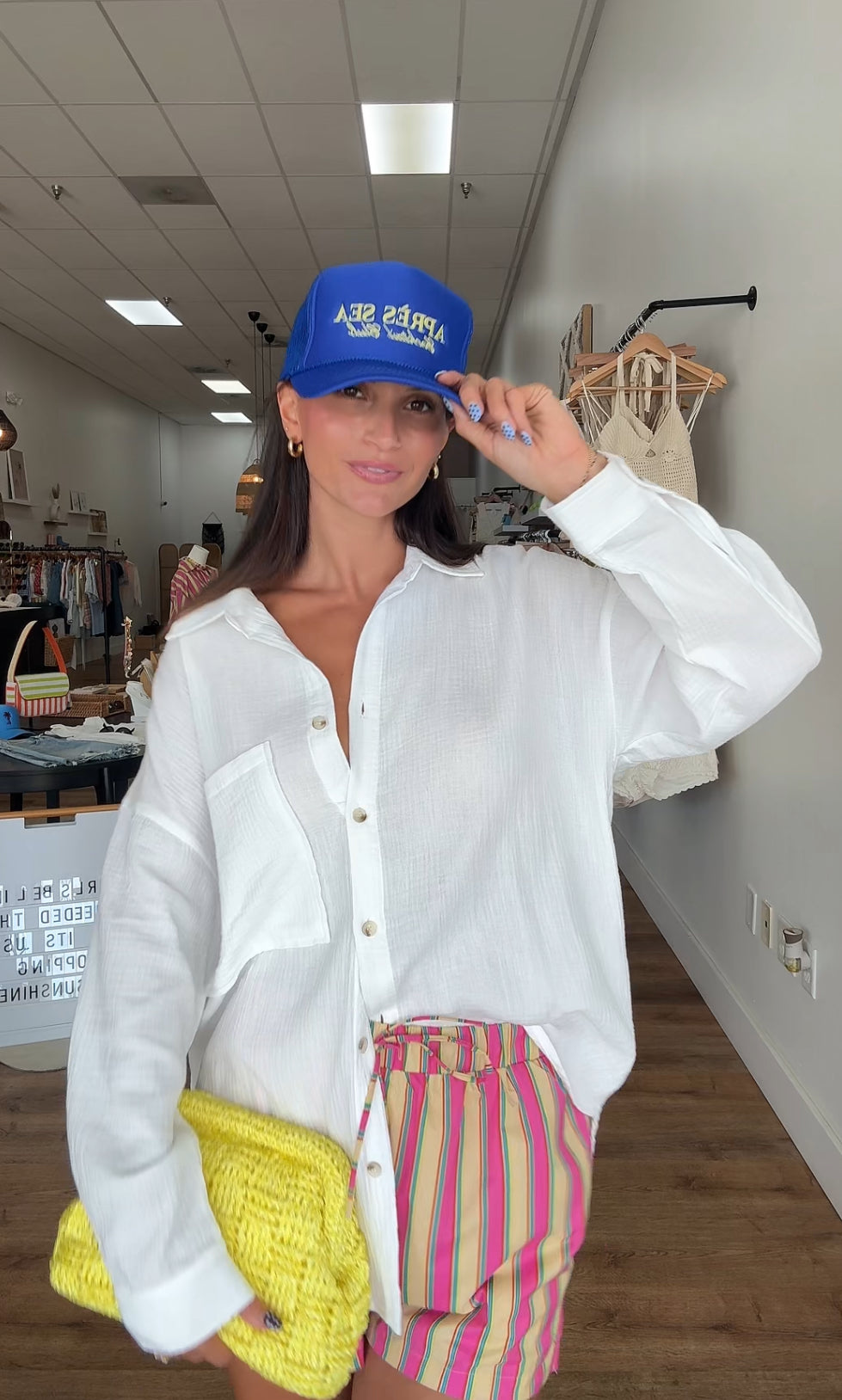 She's our GO TO and best seller for a reason. You'll find yourself reaching for this lightweight button down (probably) every day. It's perfect for layering over a tank top, wearing buttoned down and/or a beach cover up.