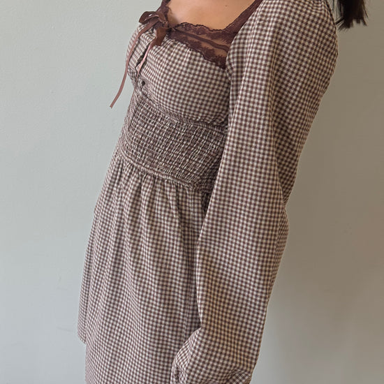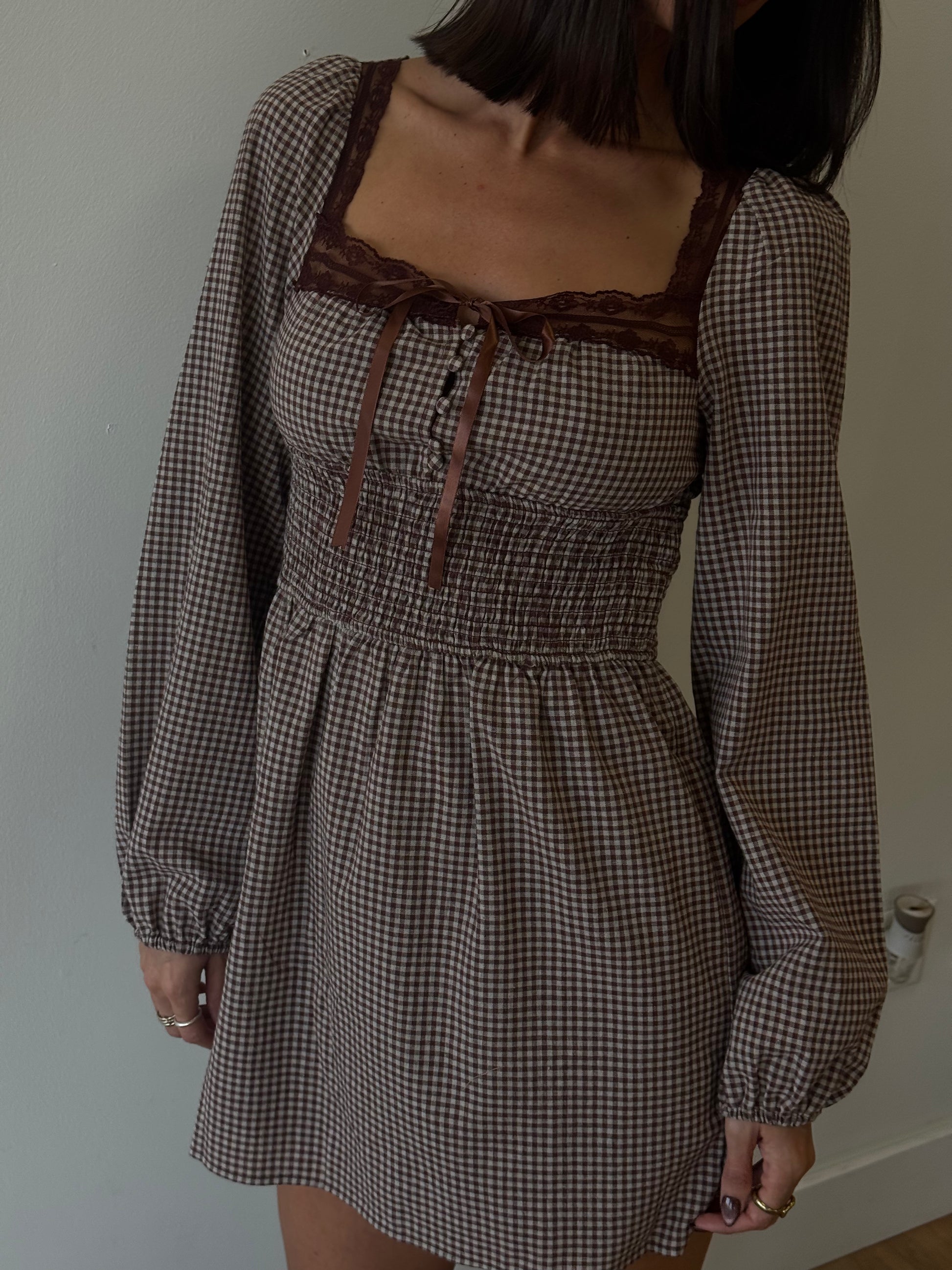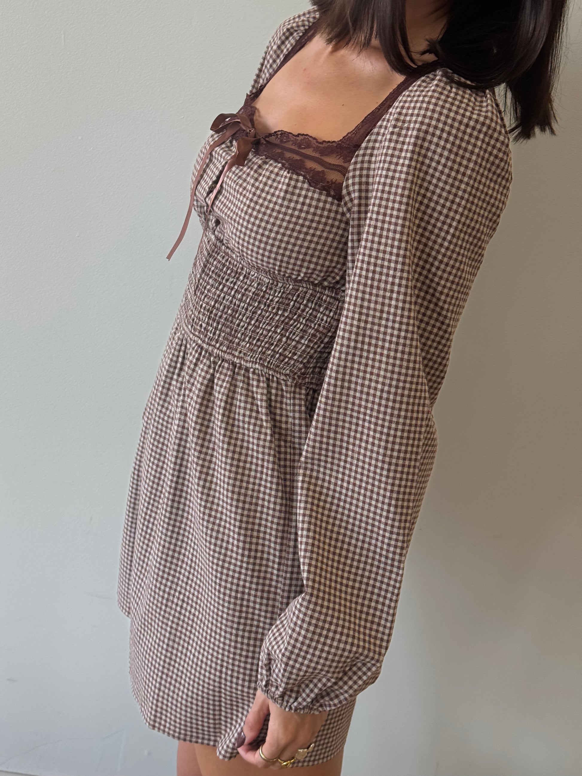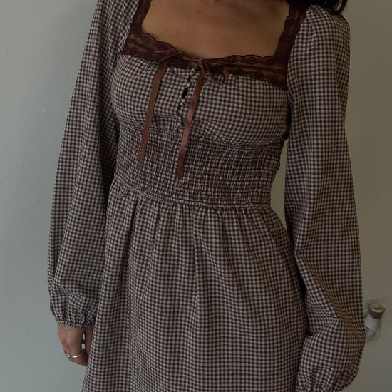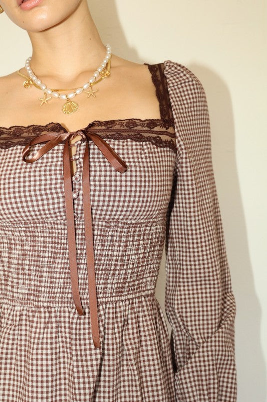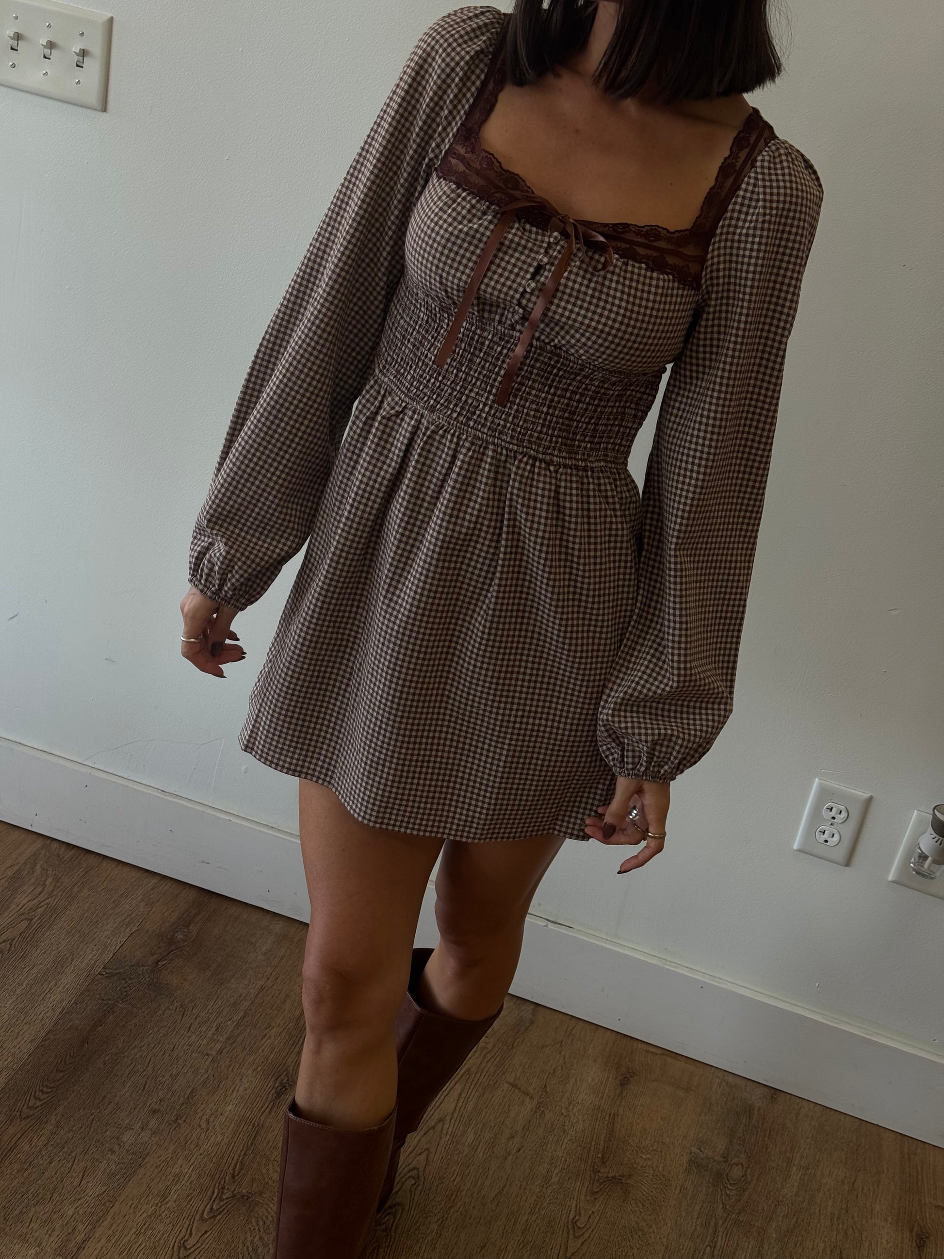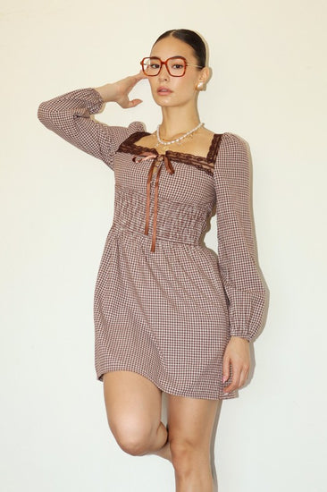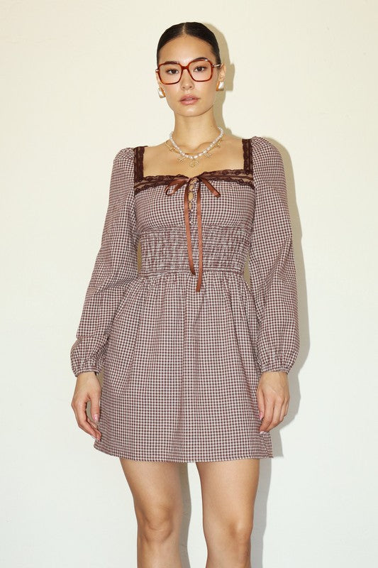 Fall in a dress! Square neck with lace detail. Linen feel. Gingham print. Stretch back/ no zipper.