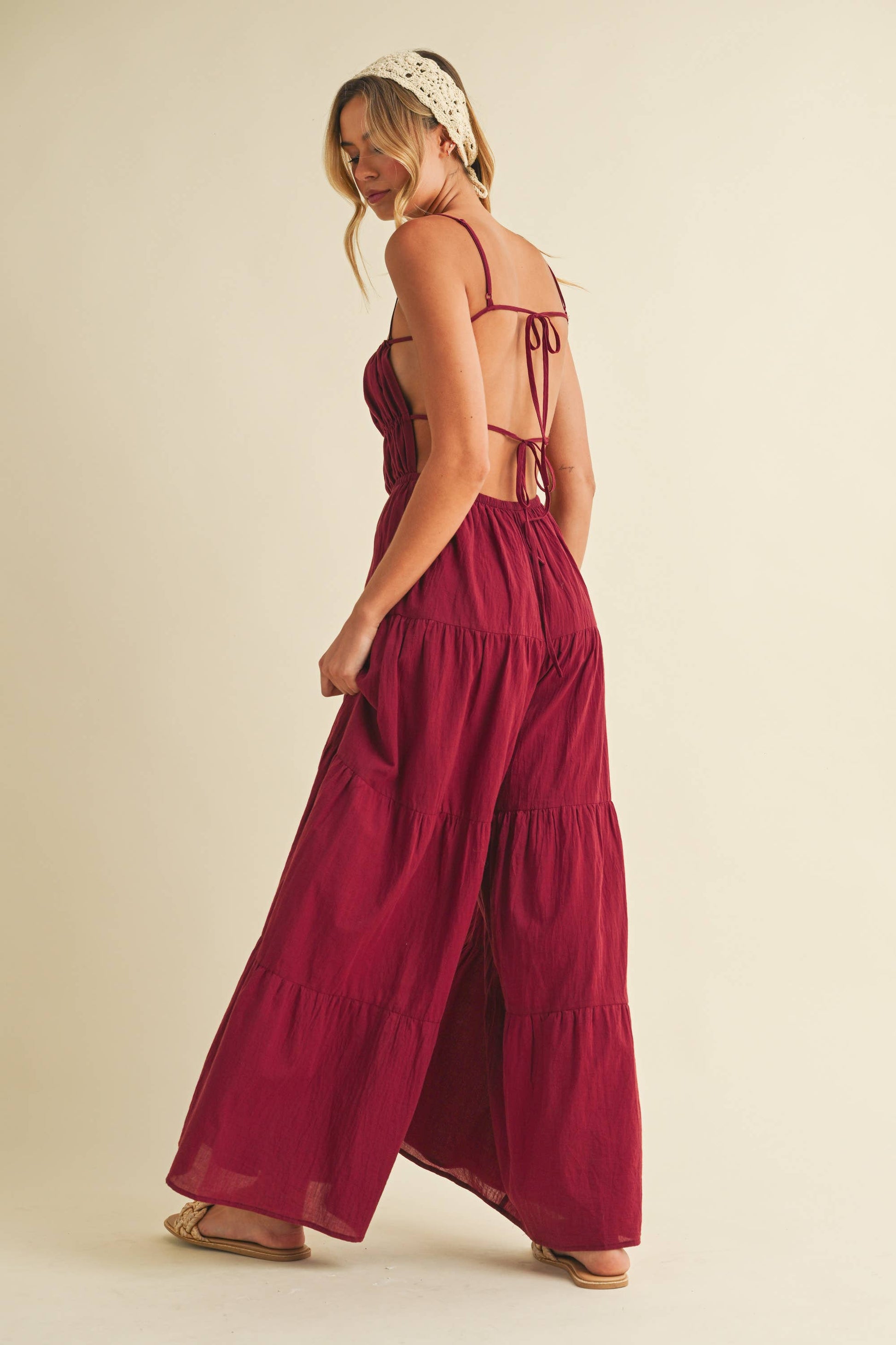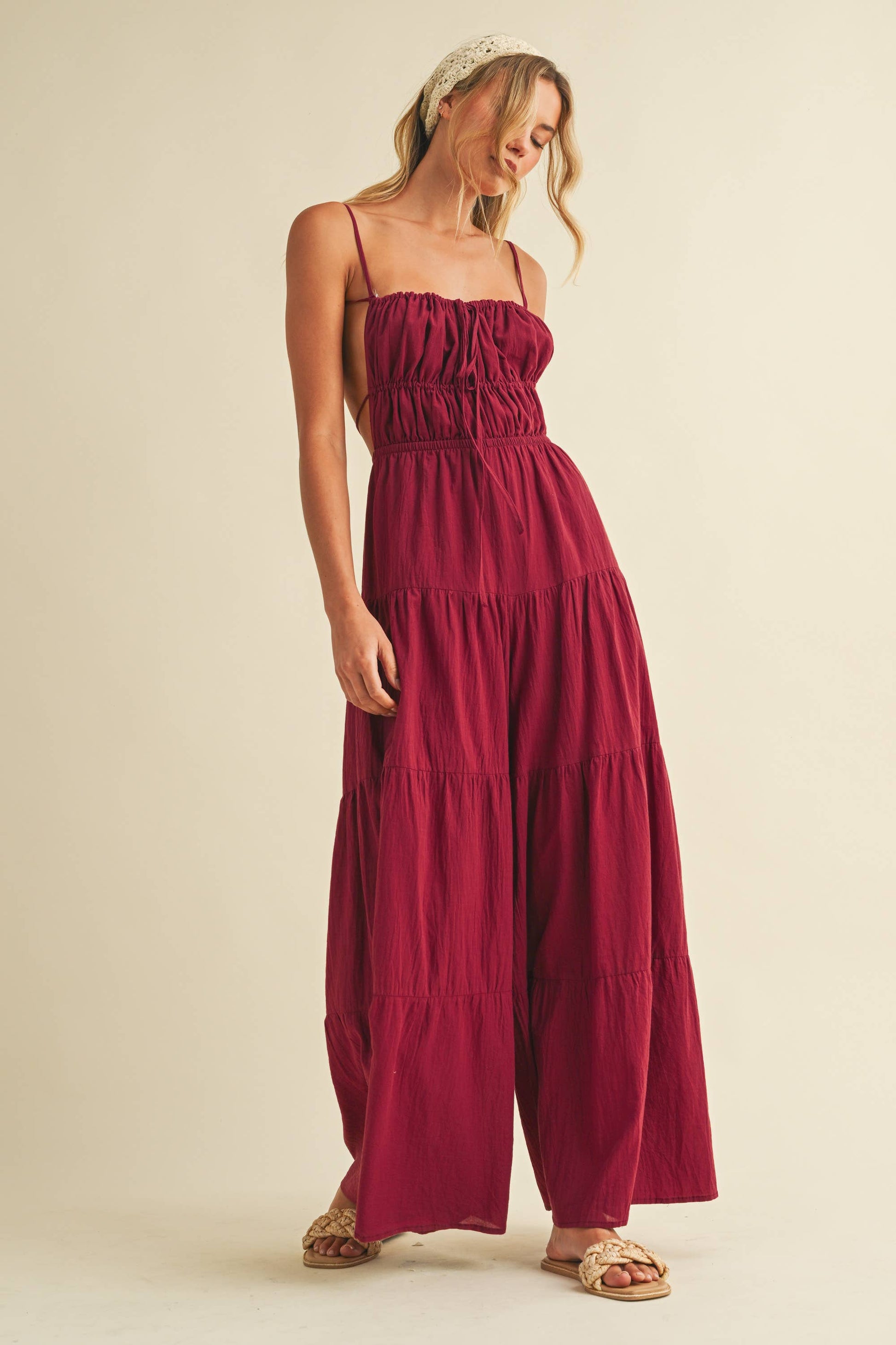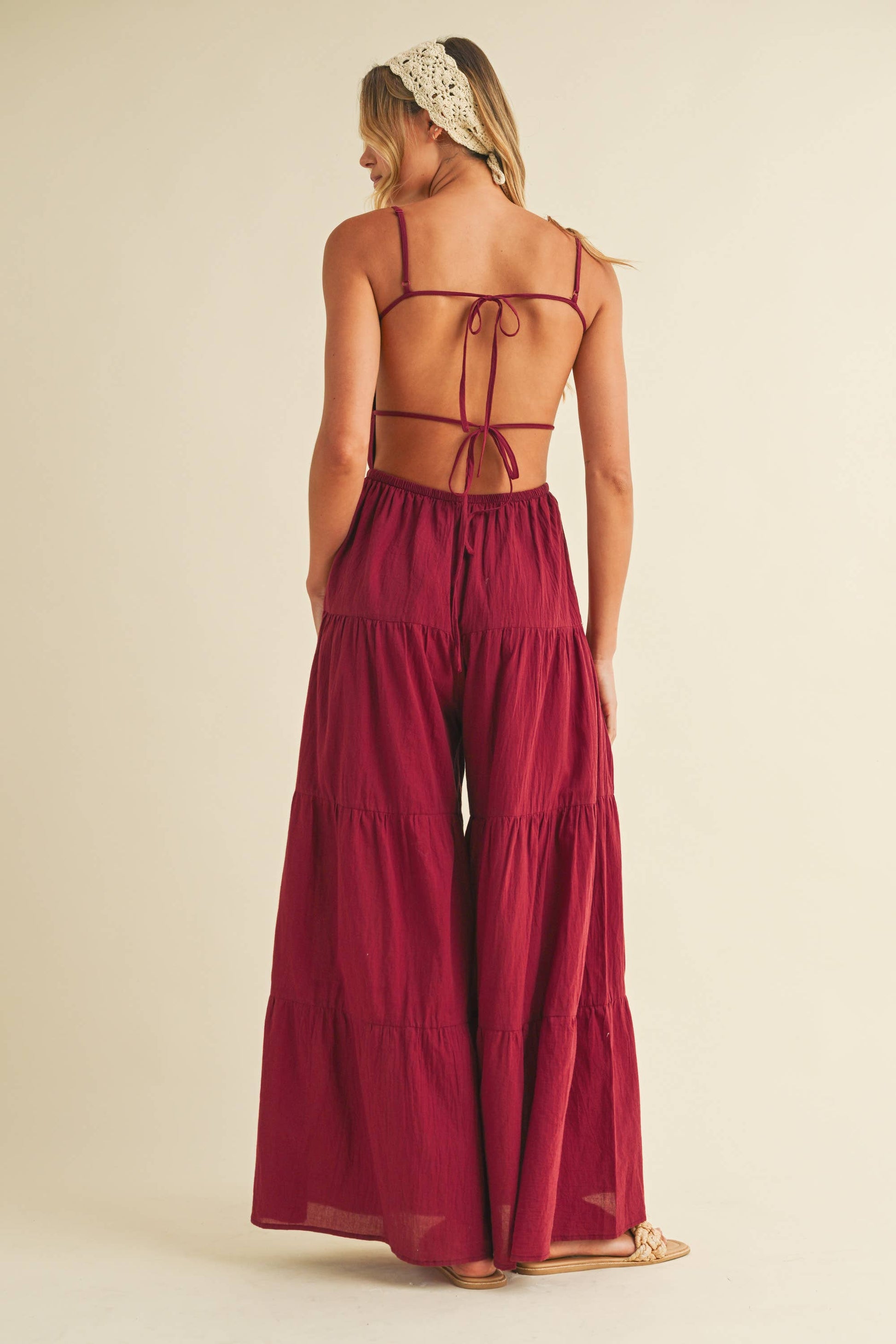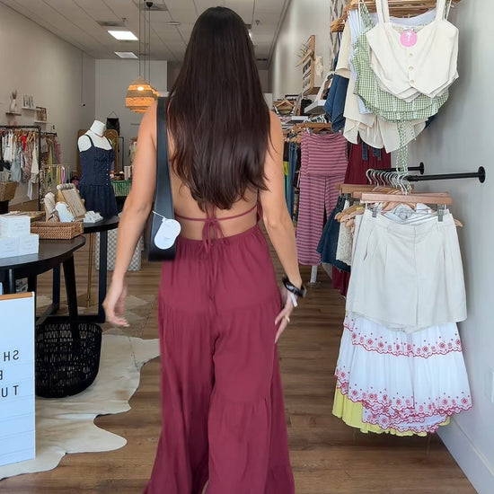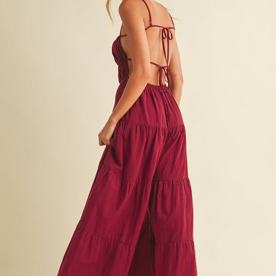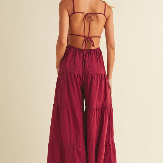 Backless wide leg jumpsuit with tiered detailing. Adjustable straps. Tall girl approved.
