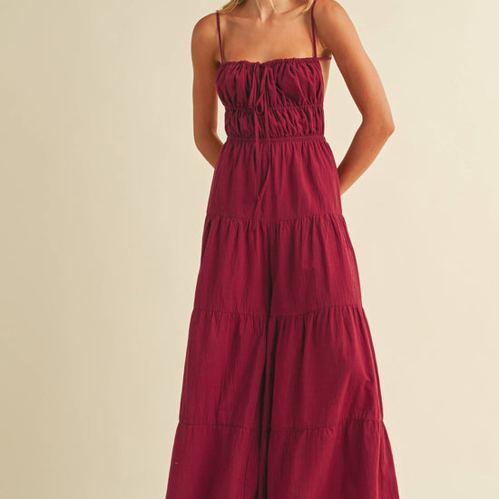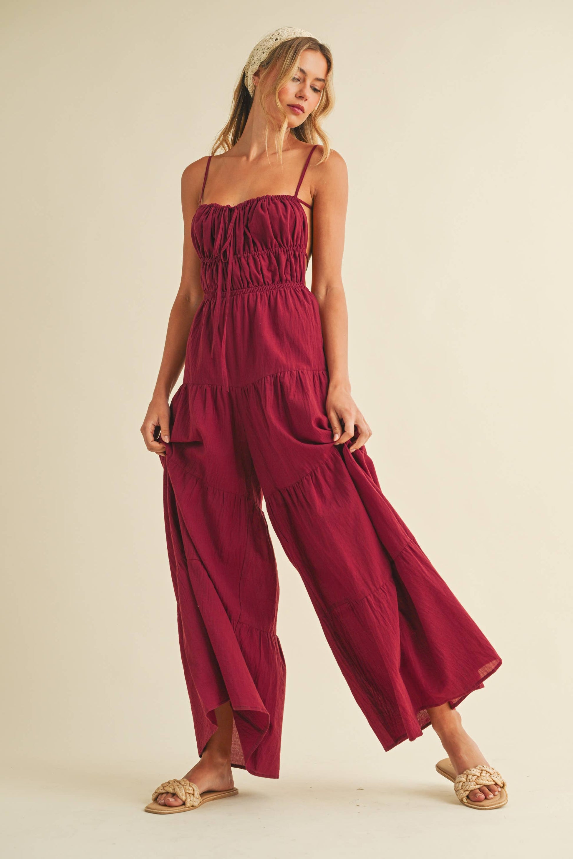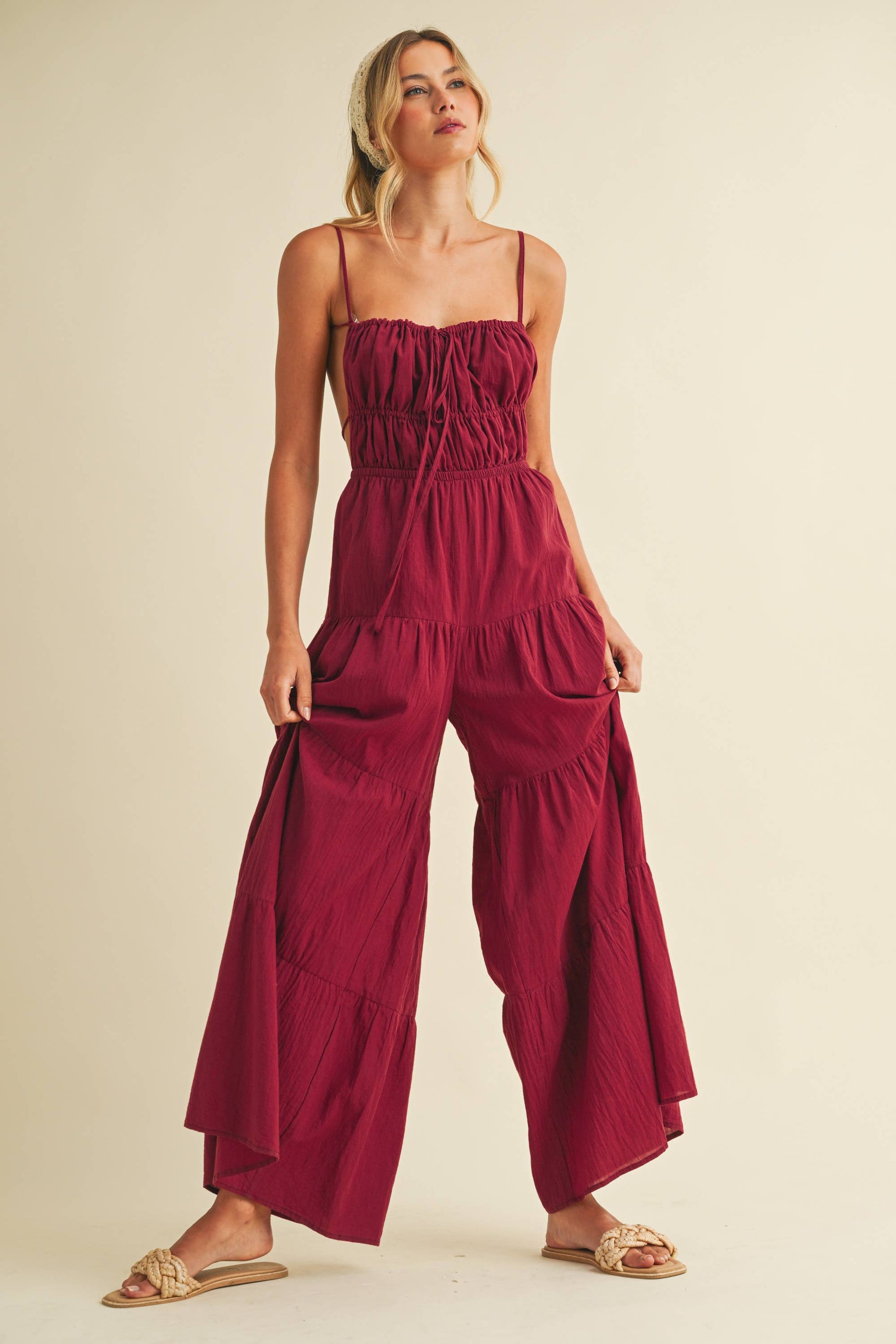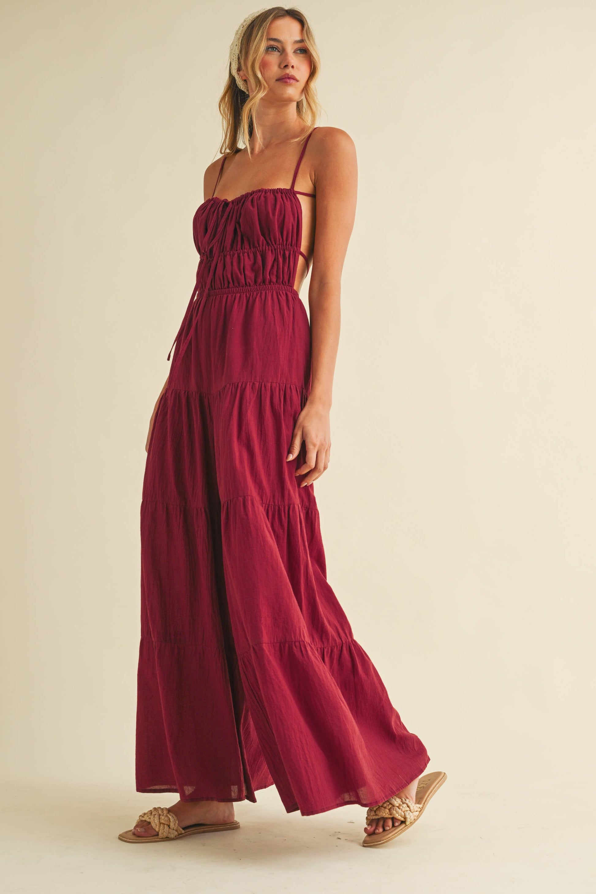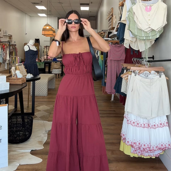 Backless wide leg jumpsuit with tiered detailing. Adjustable straps. Tall girl approved.