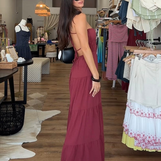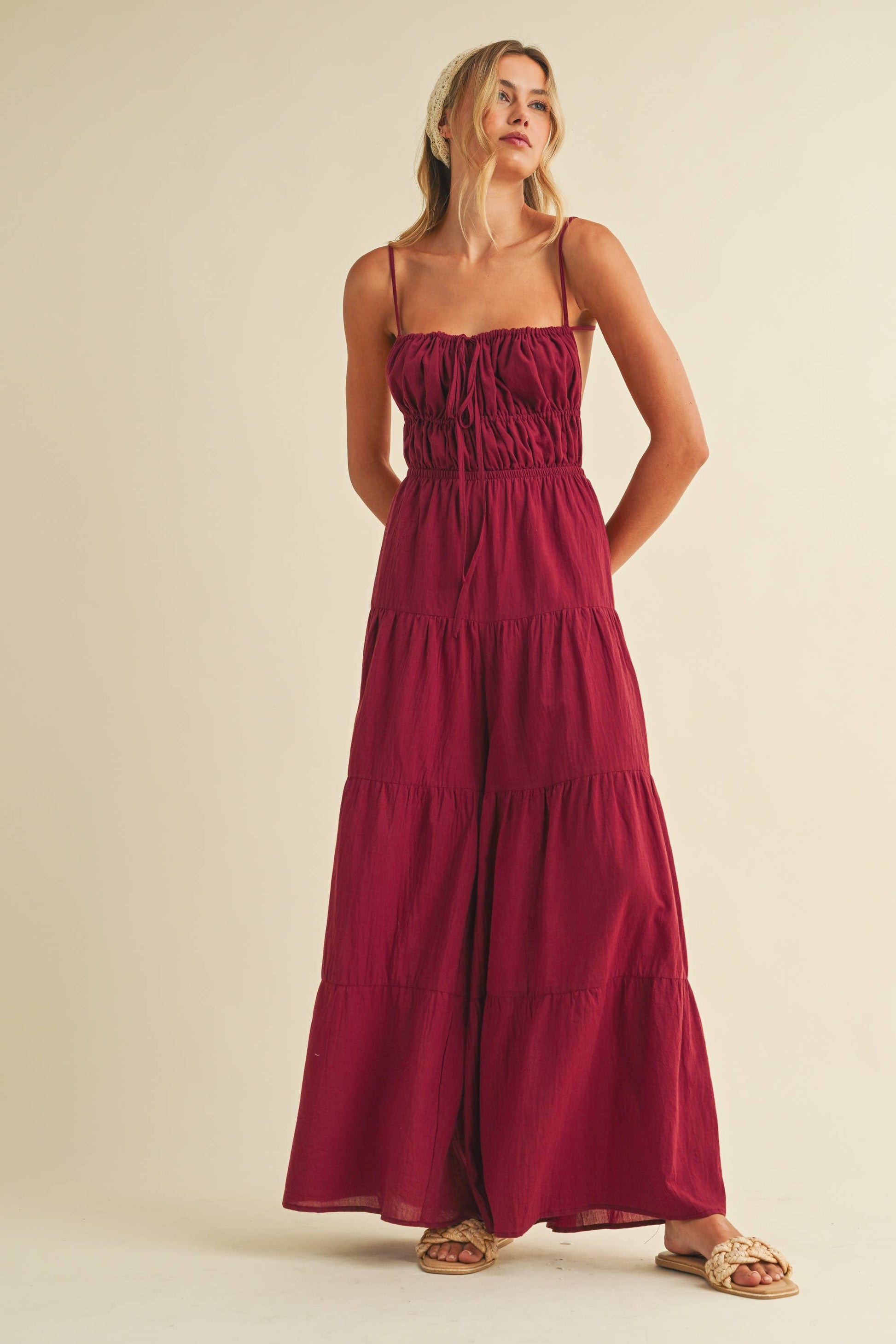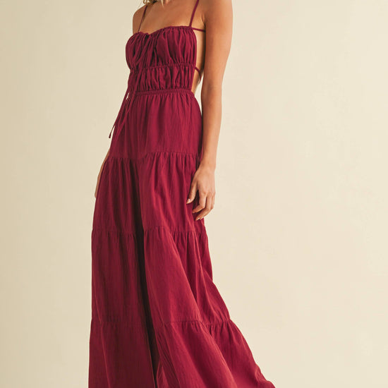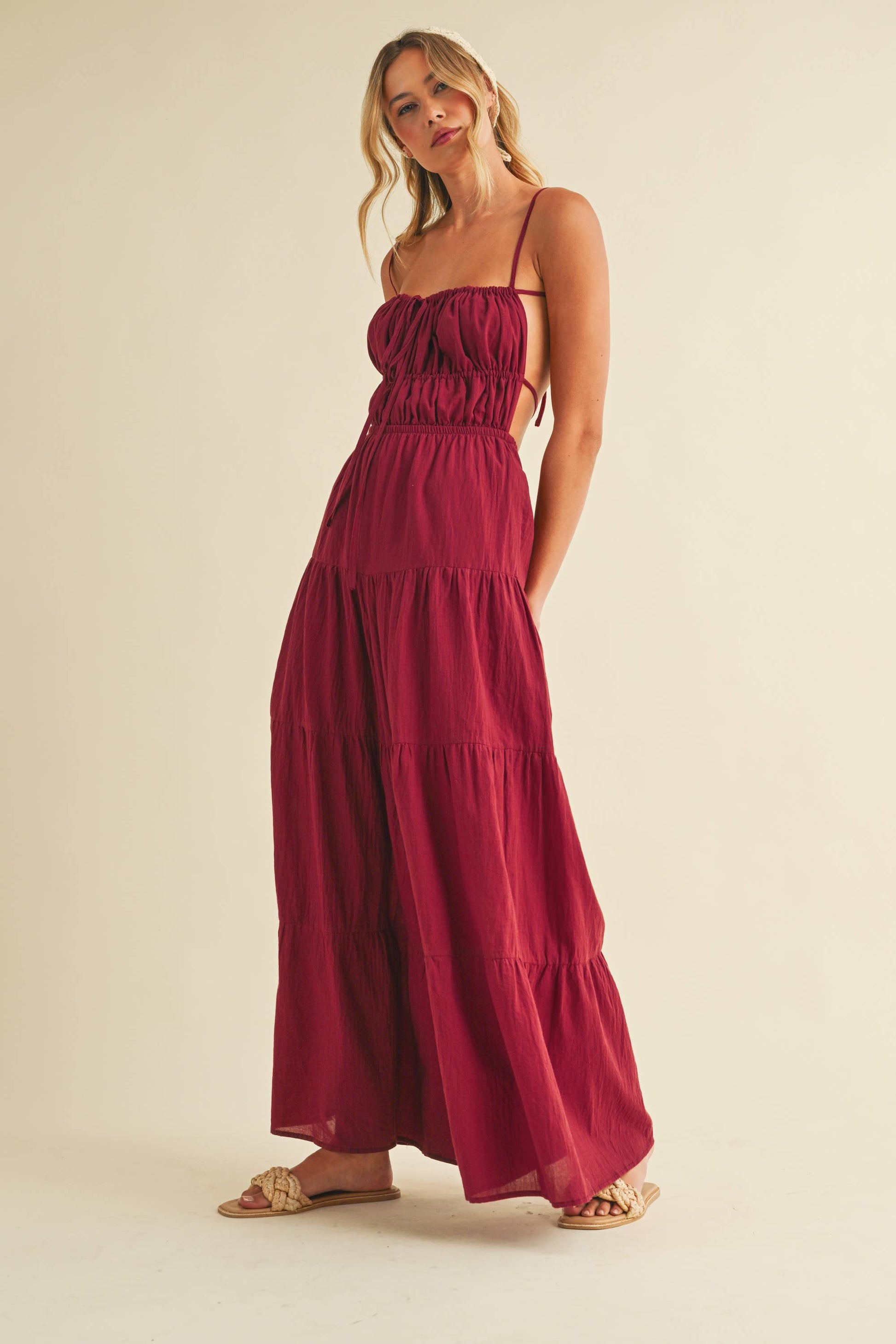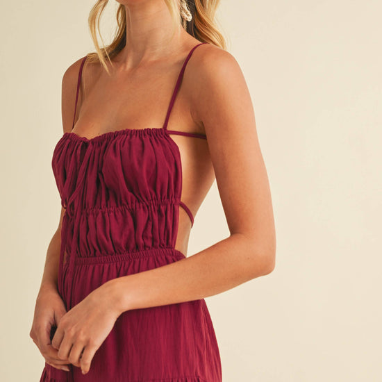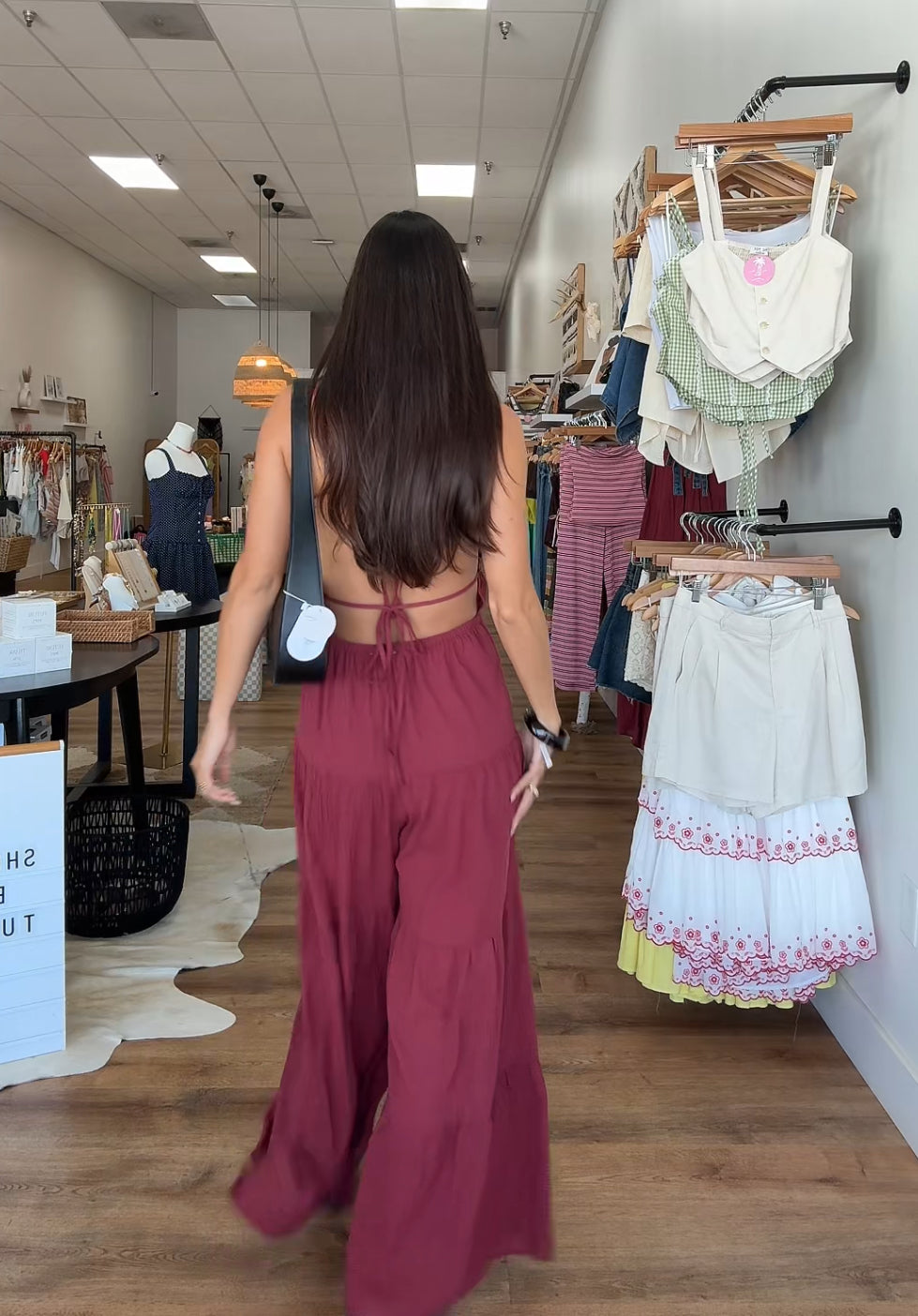 Backless wide leg jumpsuit with tiered detailing. Adjustable straps. Tall girl approved.