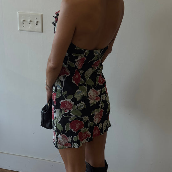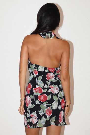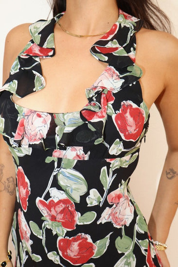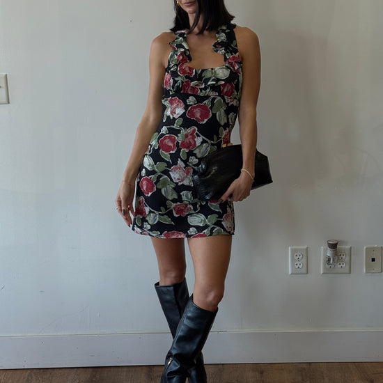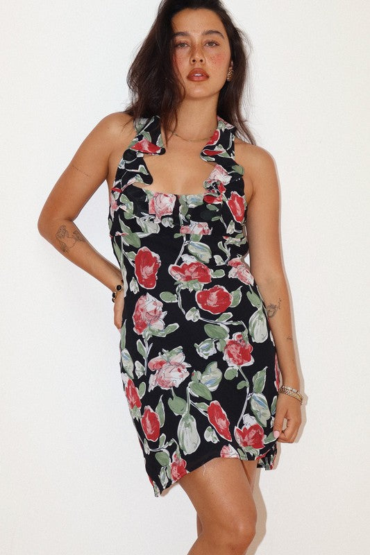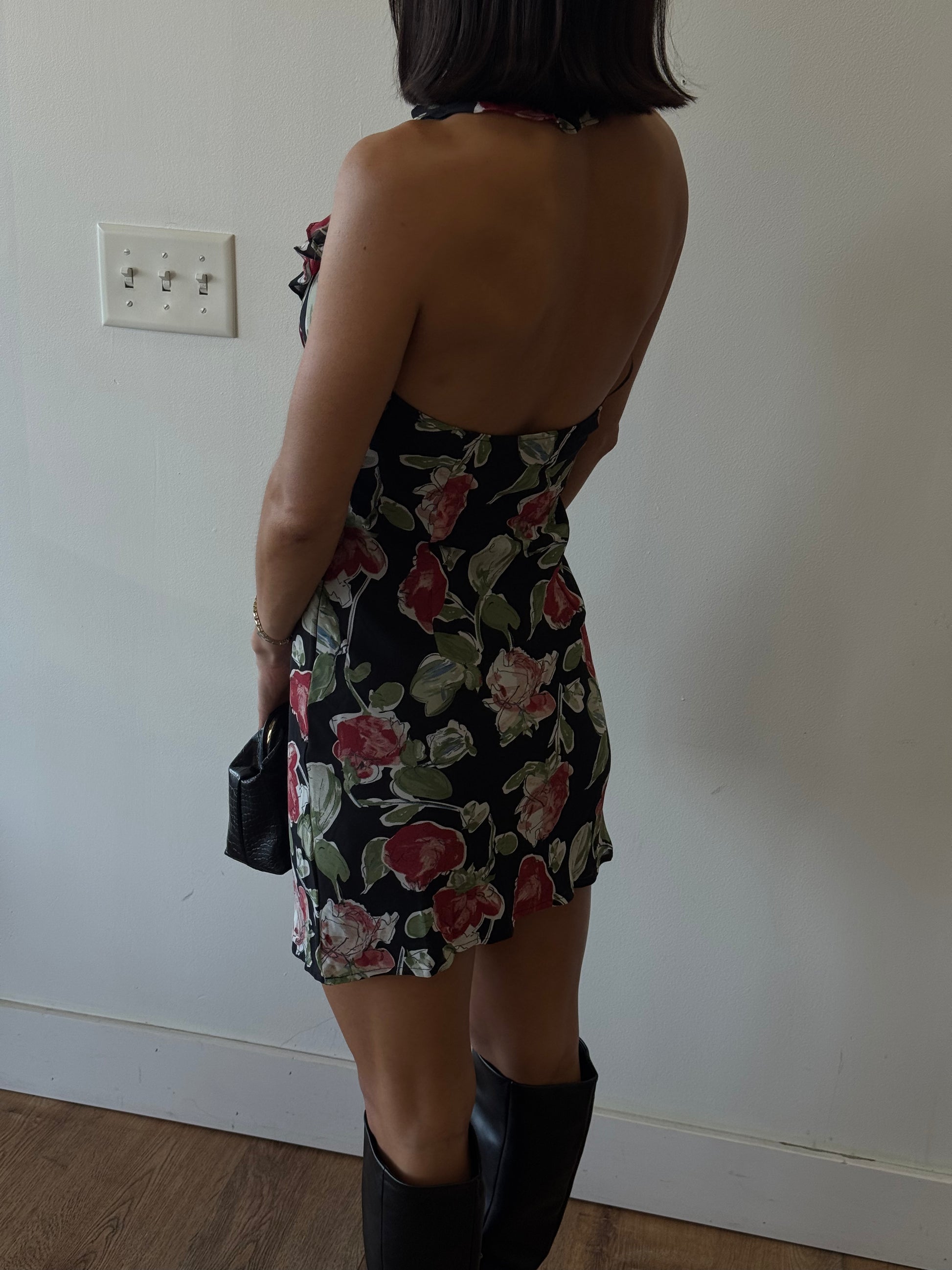 A gorgeous black mini dress with water color rose print all over. Halter neck with ruffled detail. Mini length. Side zipper.