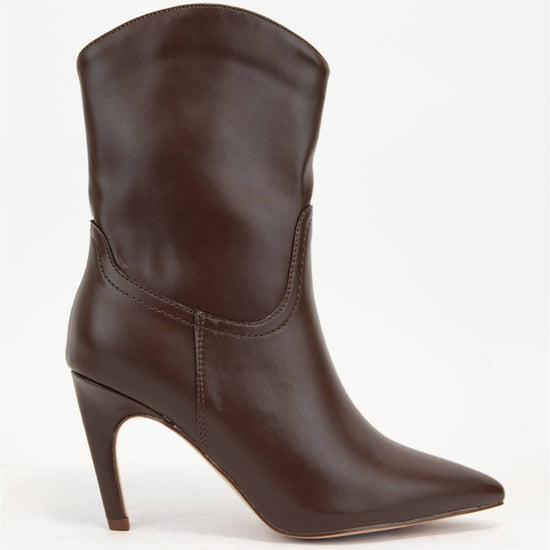 POINTED TOE ANKLE BOOTIE MID HEIGHT STILETTO HEEL SHAFT HAS SLIGHTLY WESTERN INSPIRED CURVED TOP AND SIDE STITCHING DETAIL HEEL HEIGHT: 3.25"