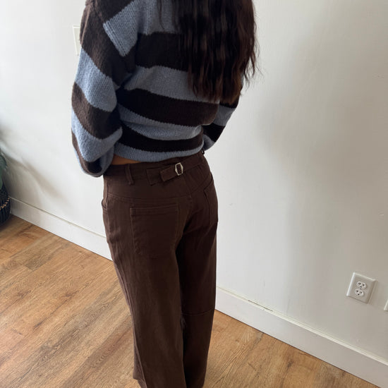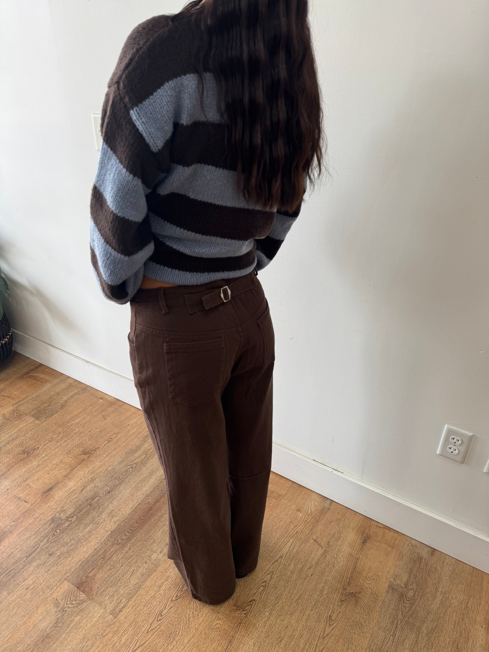 Upgrade your everyday style with our Knock on Wood Utility Pant. Made of twill, these pants have classic pockets, zipper and button with a unique adjustable buckle detail at the back for a custom fit.