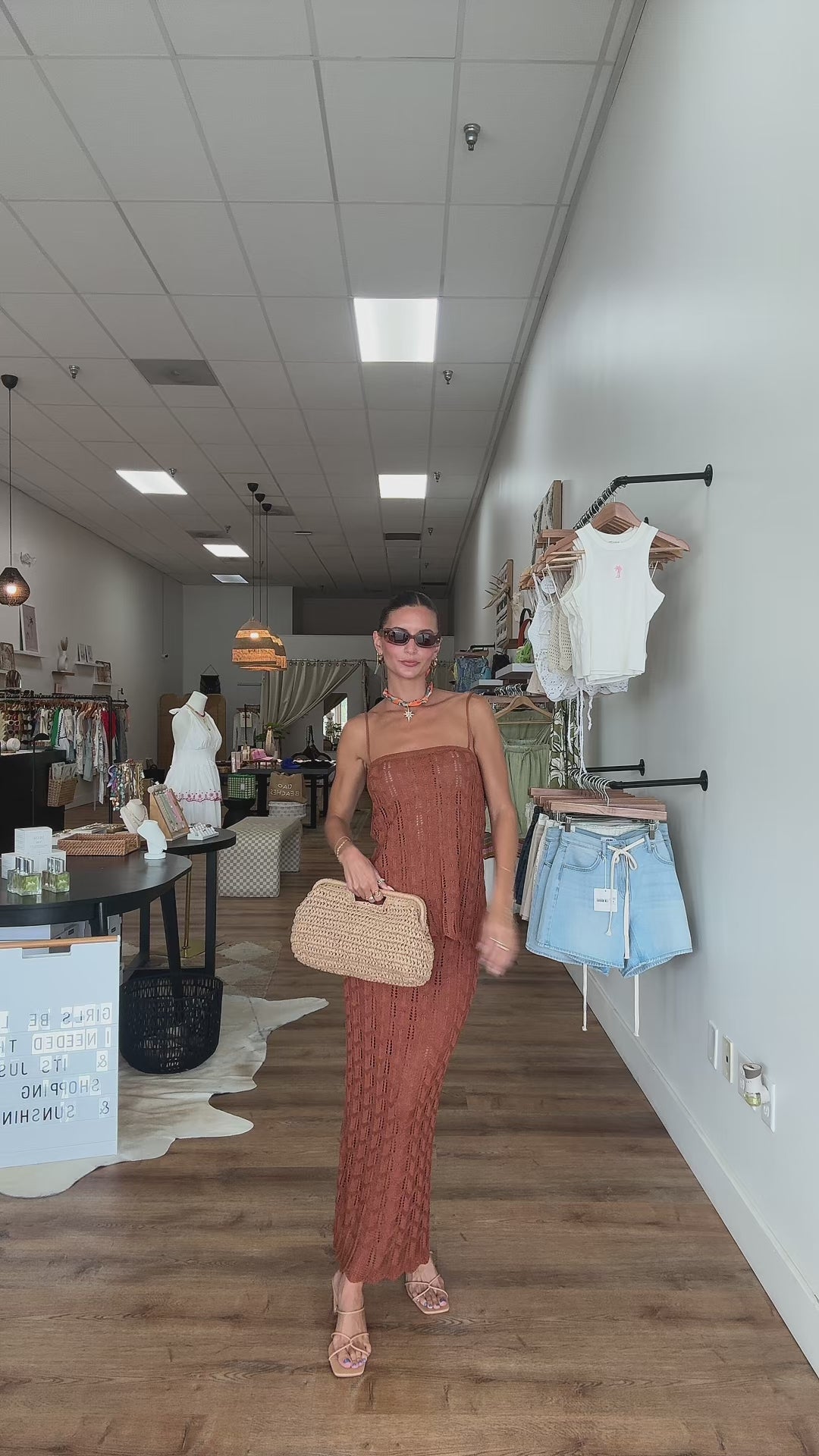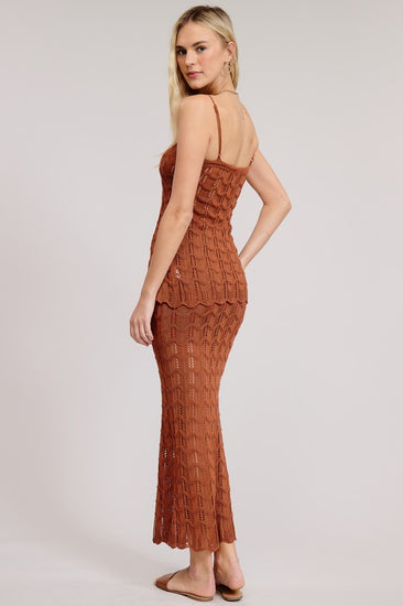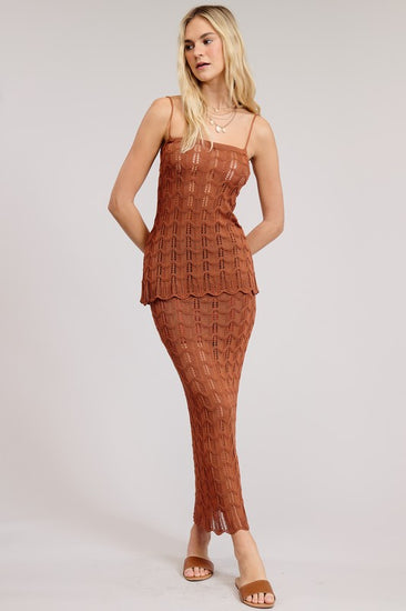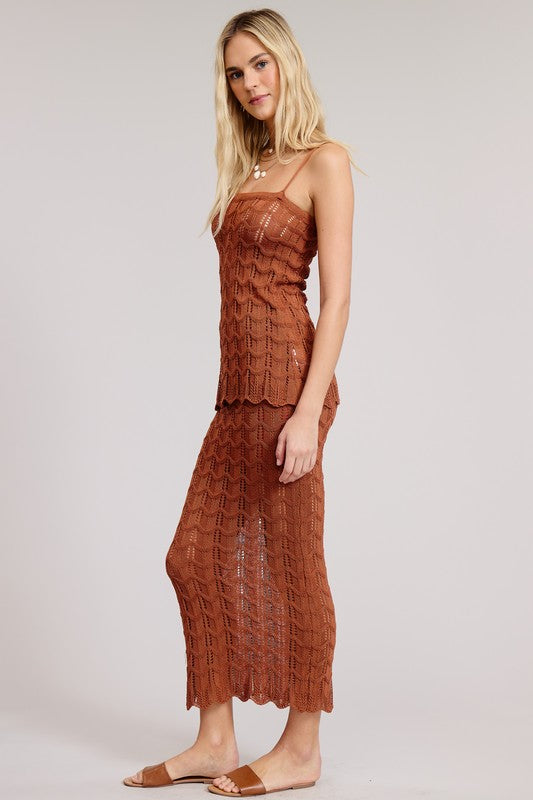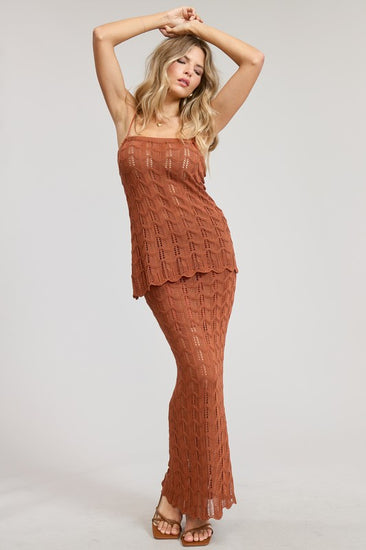 A boho inspired set perfect for those summer days and nights. This crochet set features a cutie scalloped design, including a tank top with adjustable straps and a scalloped hem. The matching maxi skirt boasts a high elastic waistband and a scalloped hem with a flattering fit and flare silhouette!