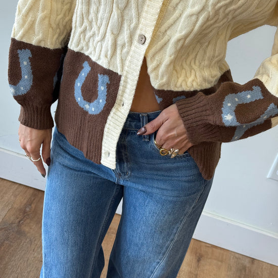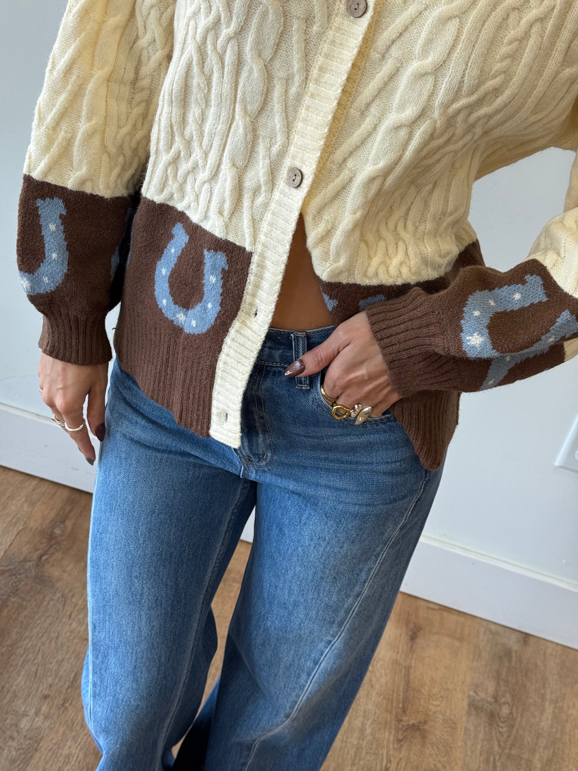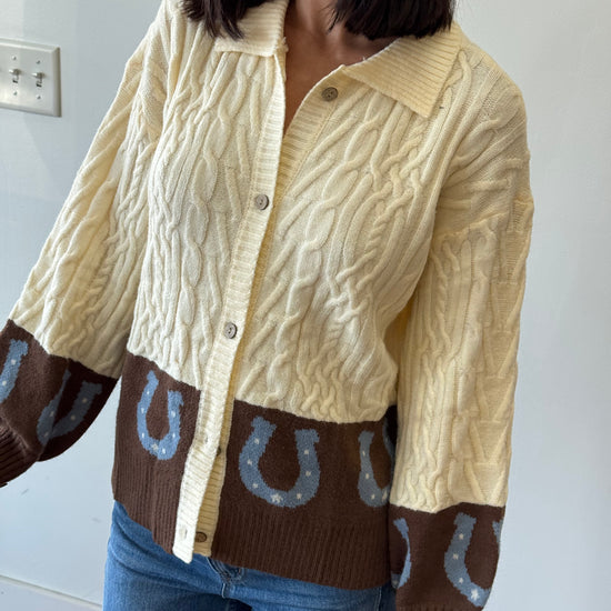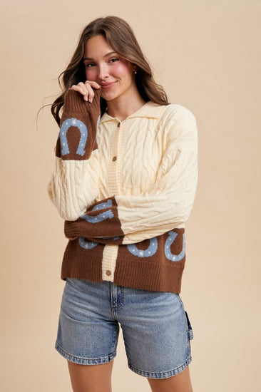 Cable textured knit cardigan sweater. Working buttons- wear her open or closed. She is so cute with the colorblocking and horseshoe print.