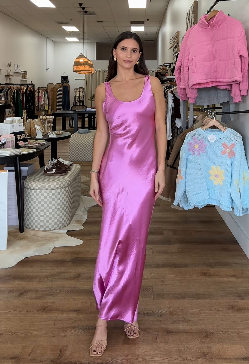 This pink gown is the perfect mix between chic and elegant! The color and shine is 100/10. Maxi Length. Lower back. Zipper enclosure.
