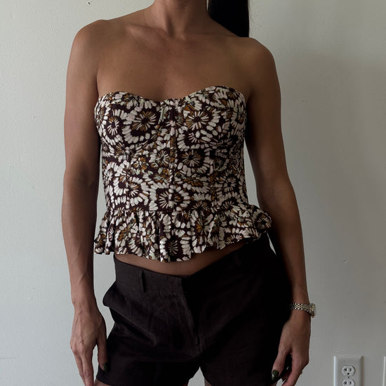A fun transitional fall piece. The Marren top features a ruffle hem, floral print and back zipper.