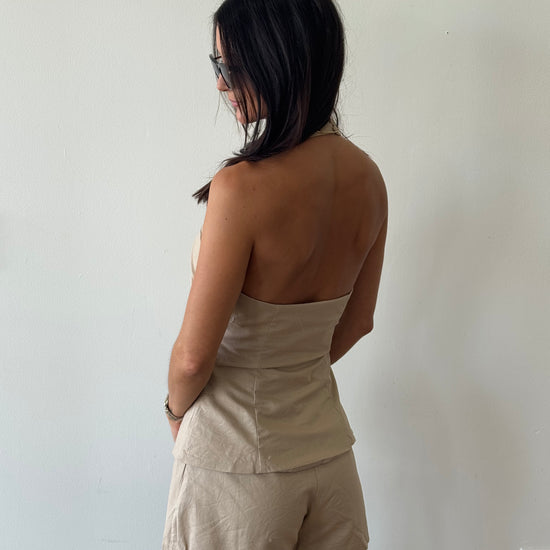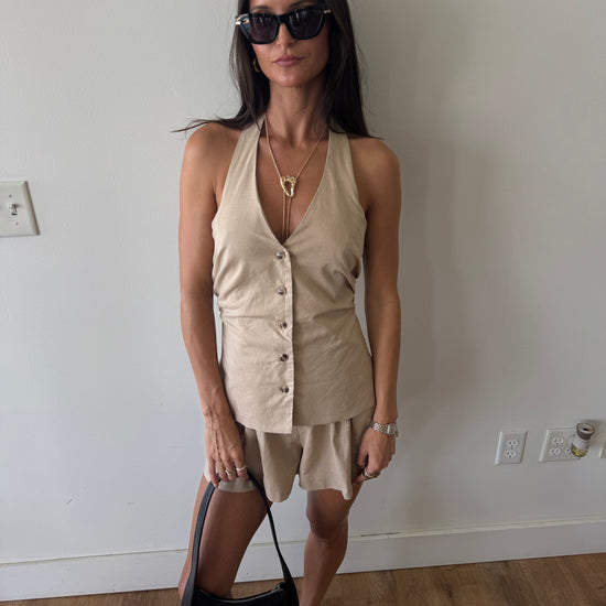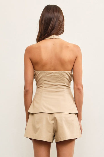 Working buttons, adjustable halter, zipper to button waist on shorts.