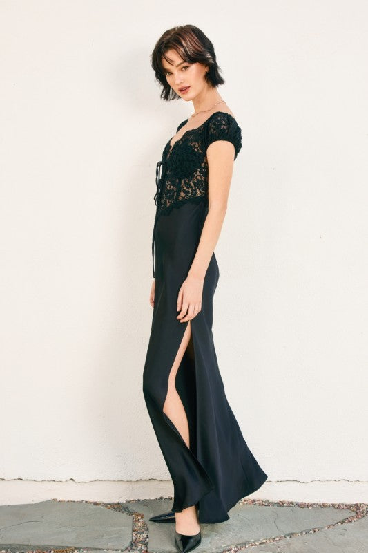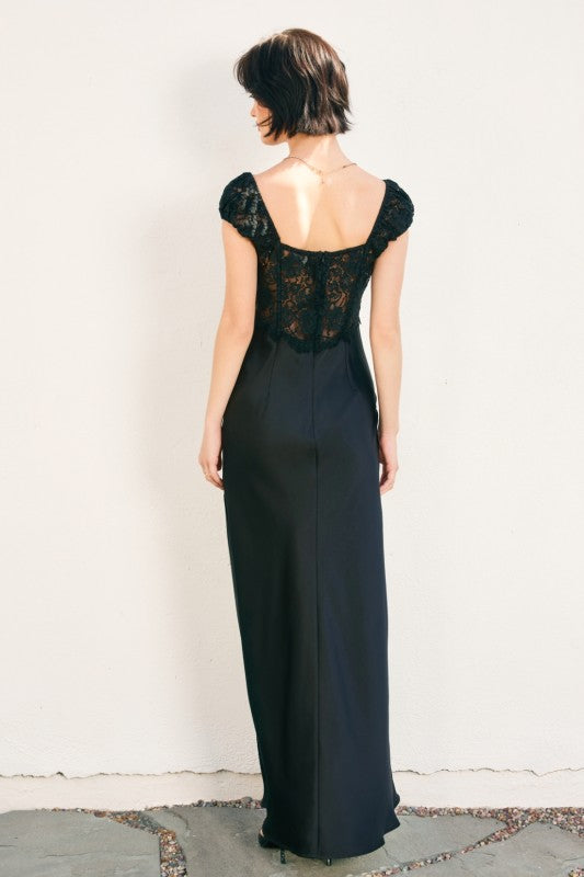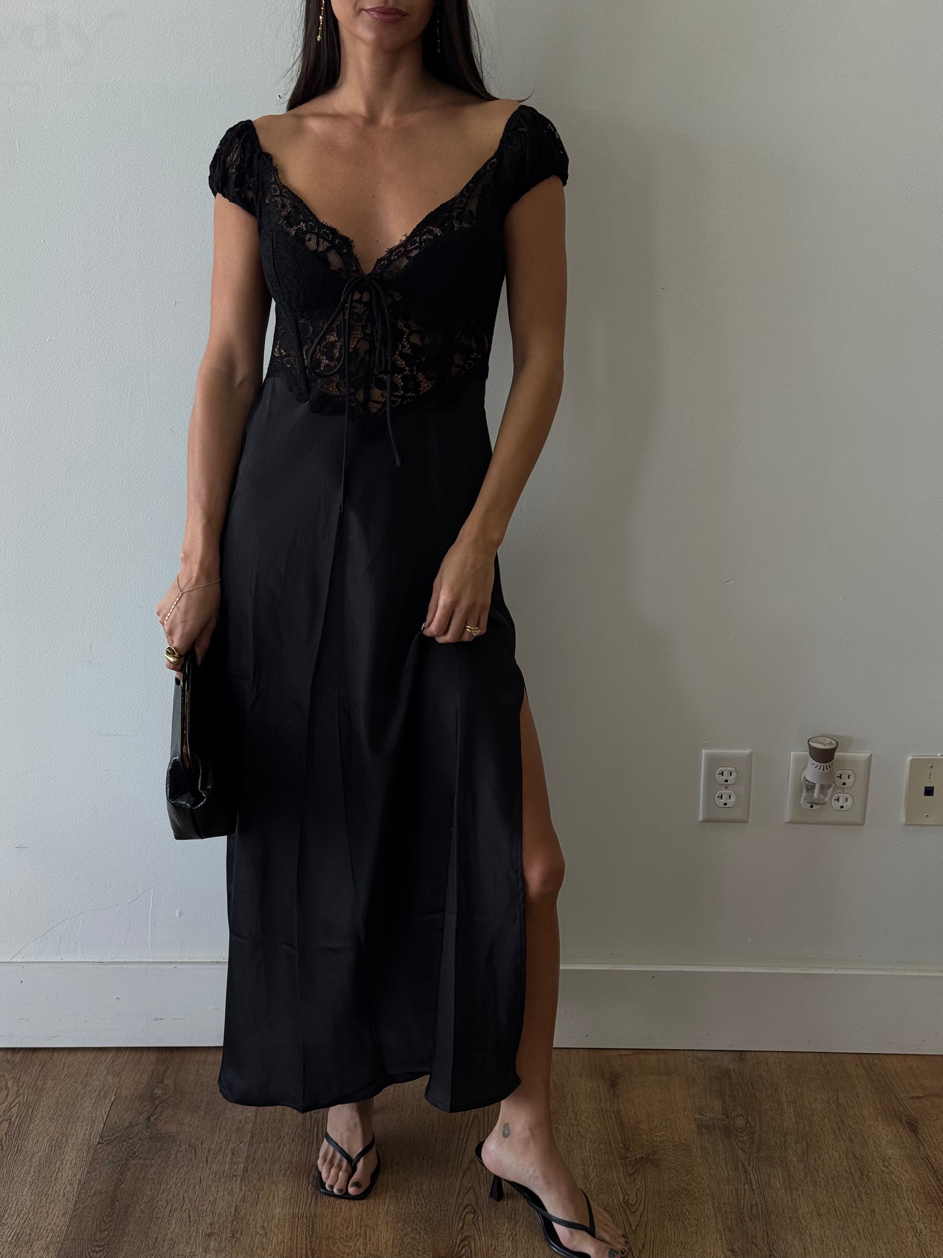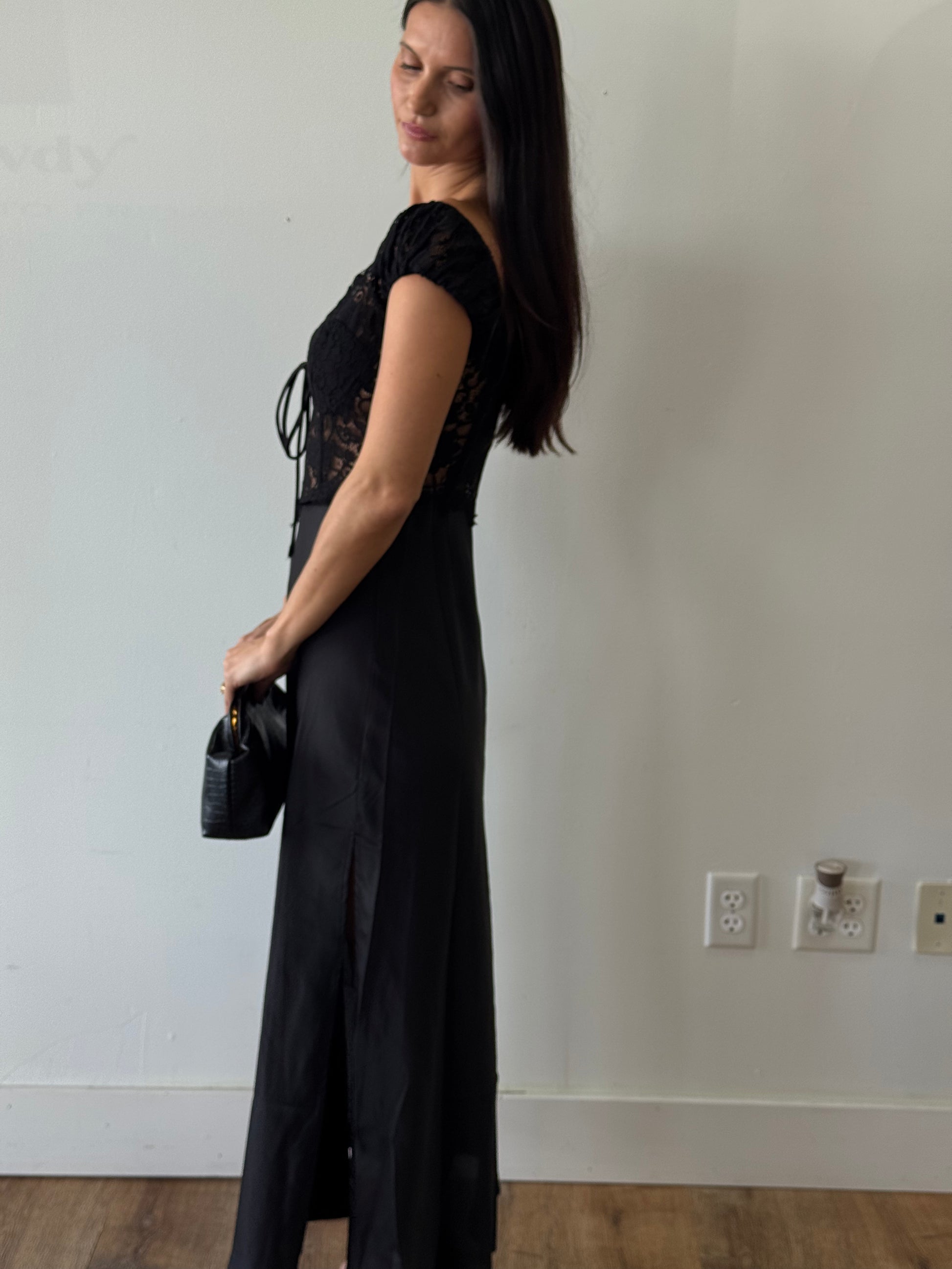 Satin midi dress with see through lave bodice ( lined at bust ) Side Slit. Back Zipper.