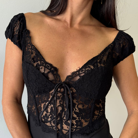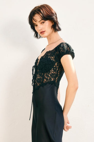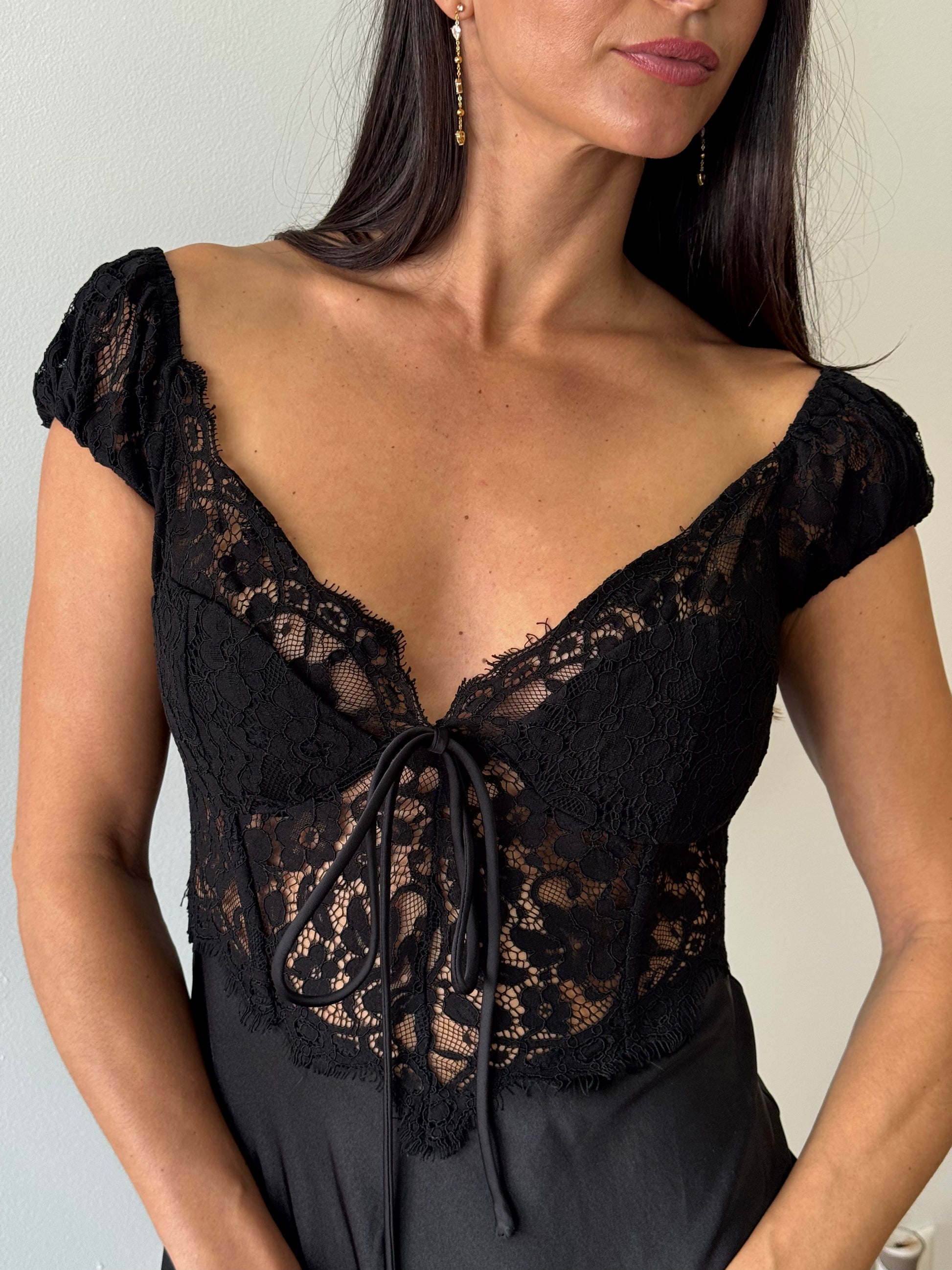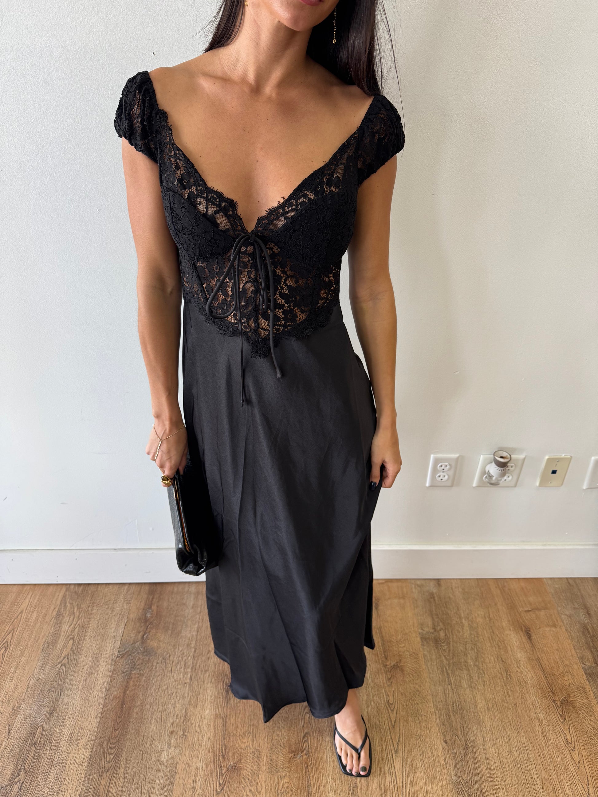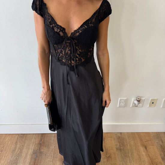 Satin midi dress with see through lave bodice ( lined at bust ) Side Slit. Back Zipper.