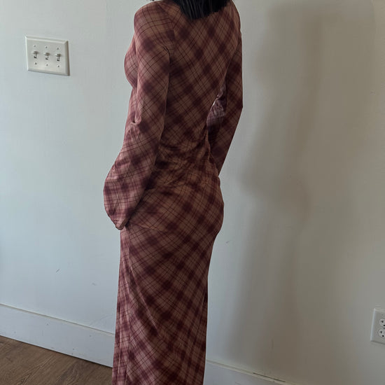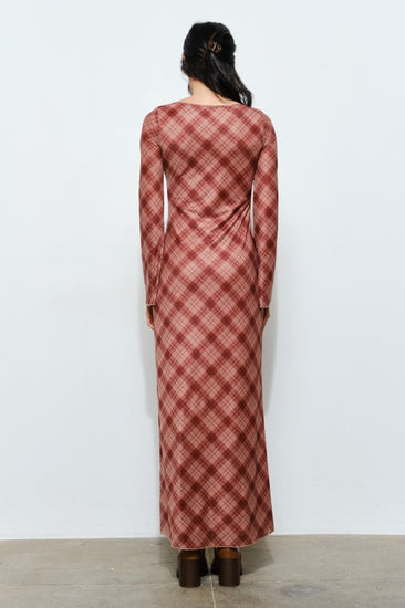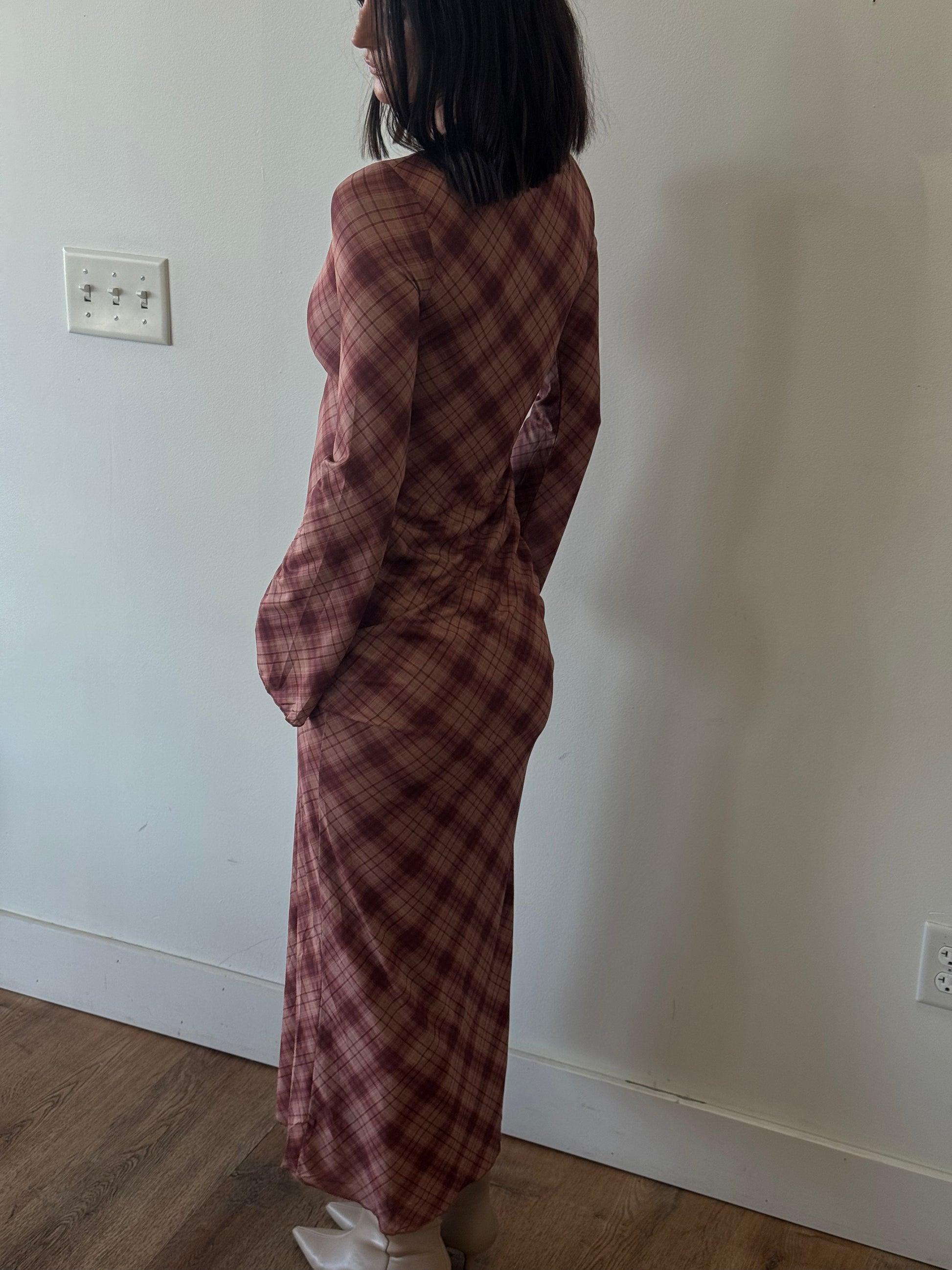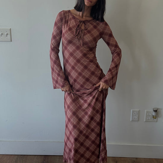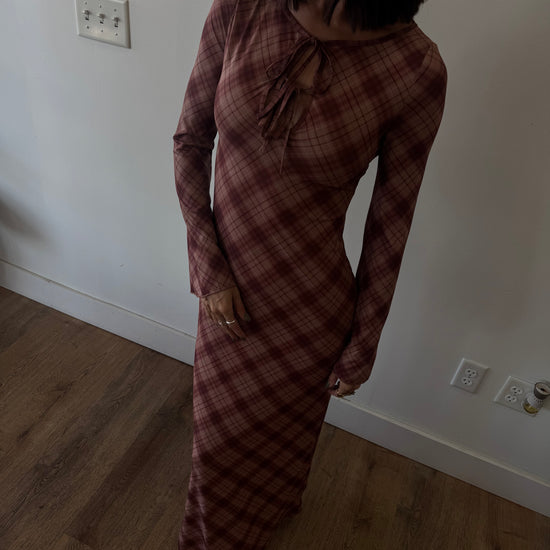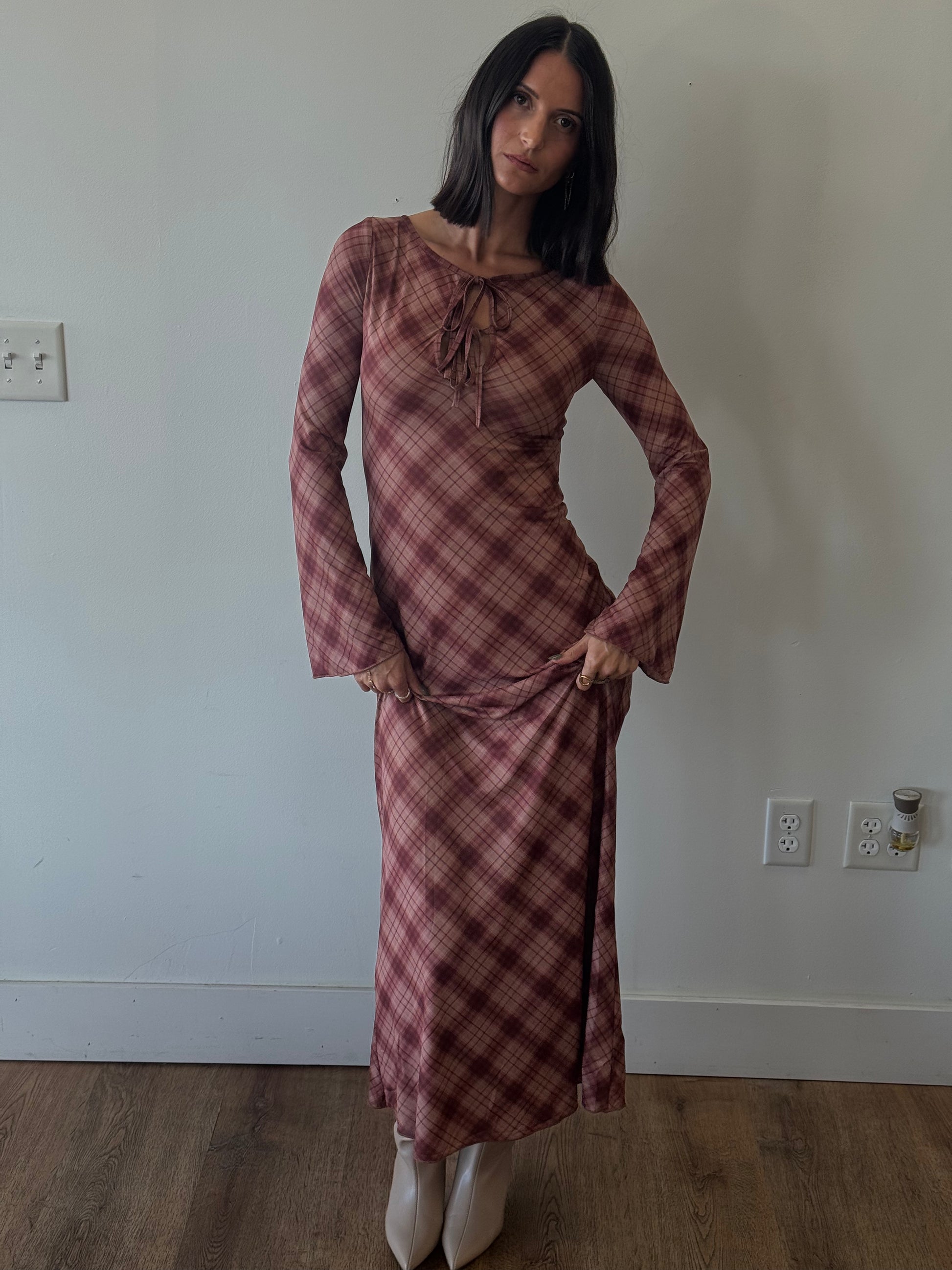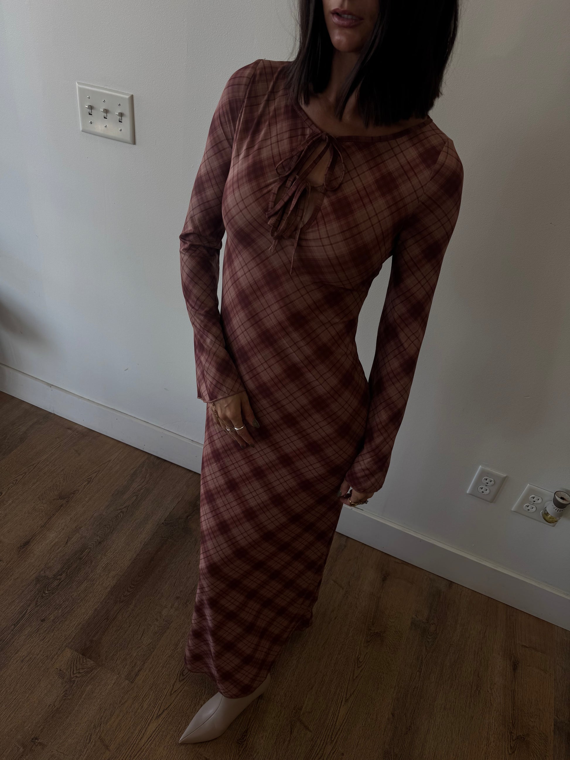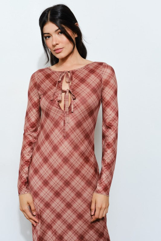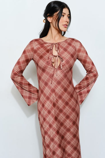 Make everyday feel special in our Redwood Mesh Maxi. This dress features a classic plaid fabric, a flirty self tie in the front, and long, slightly flared sleeves for a modern twist. She's the epitome of effortless elegance and could be your look for your next brunch or date night. Fully lined. Some stretch. No zipper.