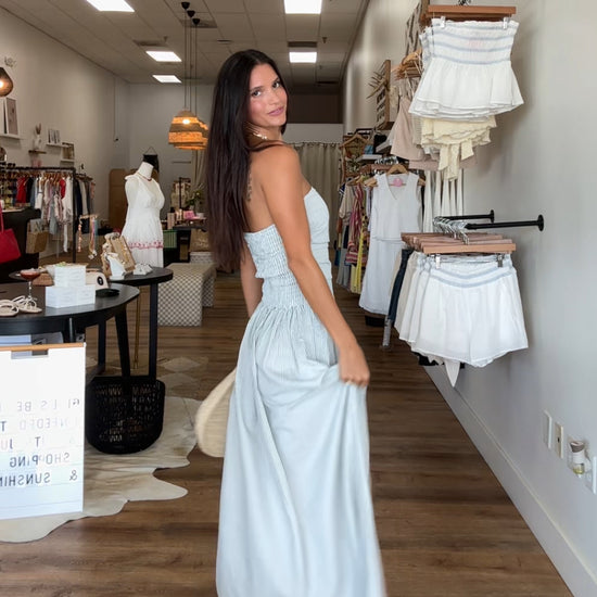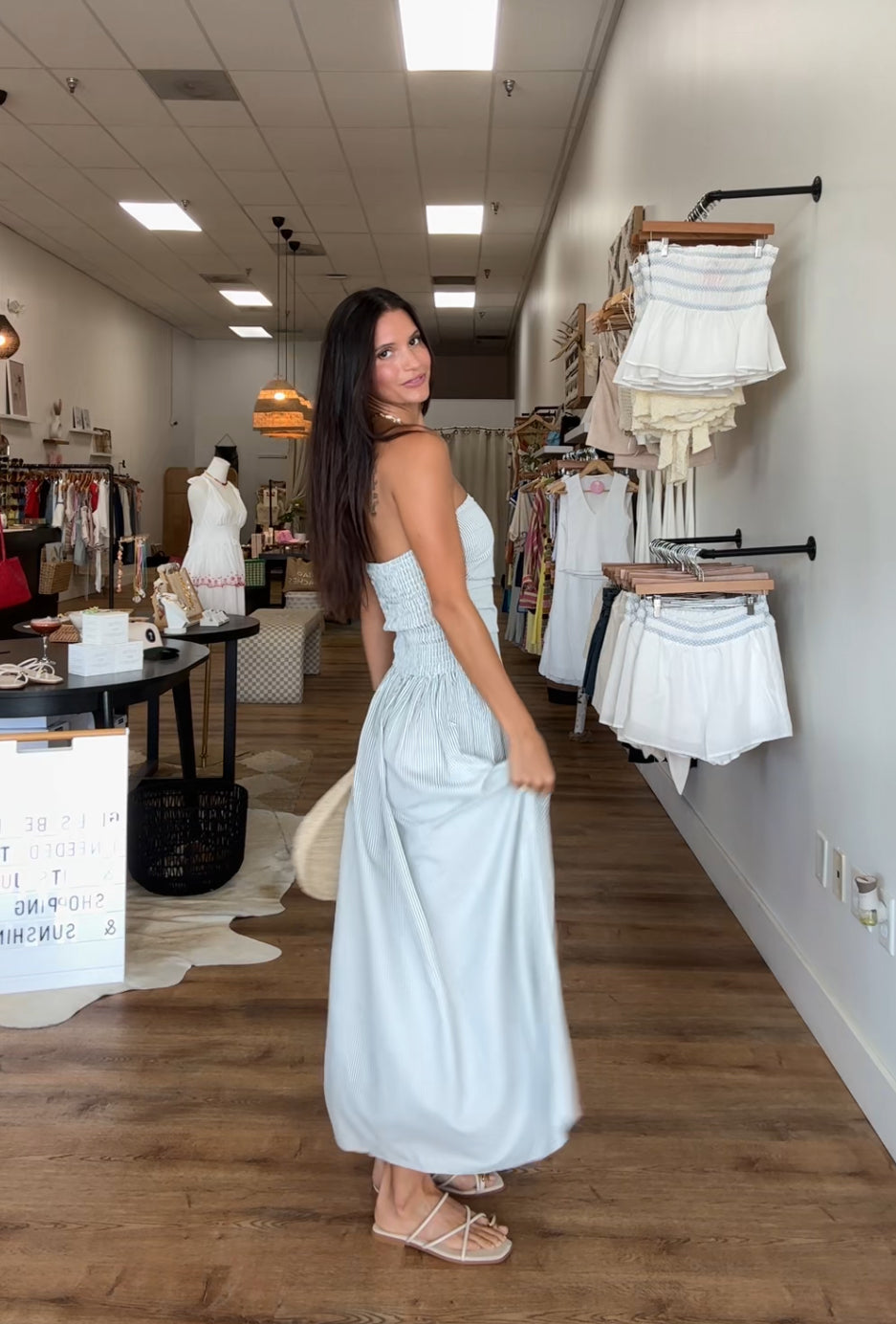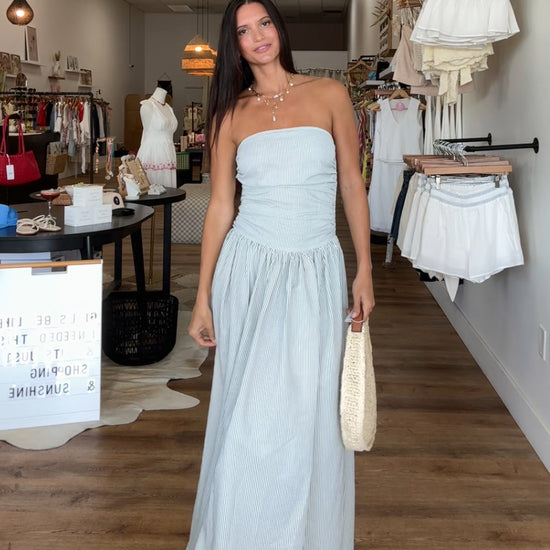 This stripe midi has a drop waist silhouette with a tube top and expandable back.