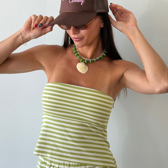 That easy, throw-on-and-go staple 💚 This striped tube top is soft, stretchy, and perfectly fitted for an effortless coastal vibe. Wear her solo or pair with the matching pants for the full look.