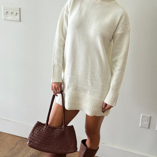 A winter essential! This high neck sweater dress offers a relaxed fit, perfect for enhancing an outfit but staying stylish.