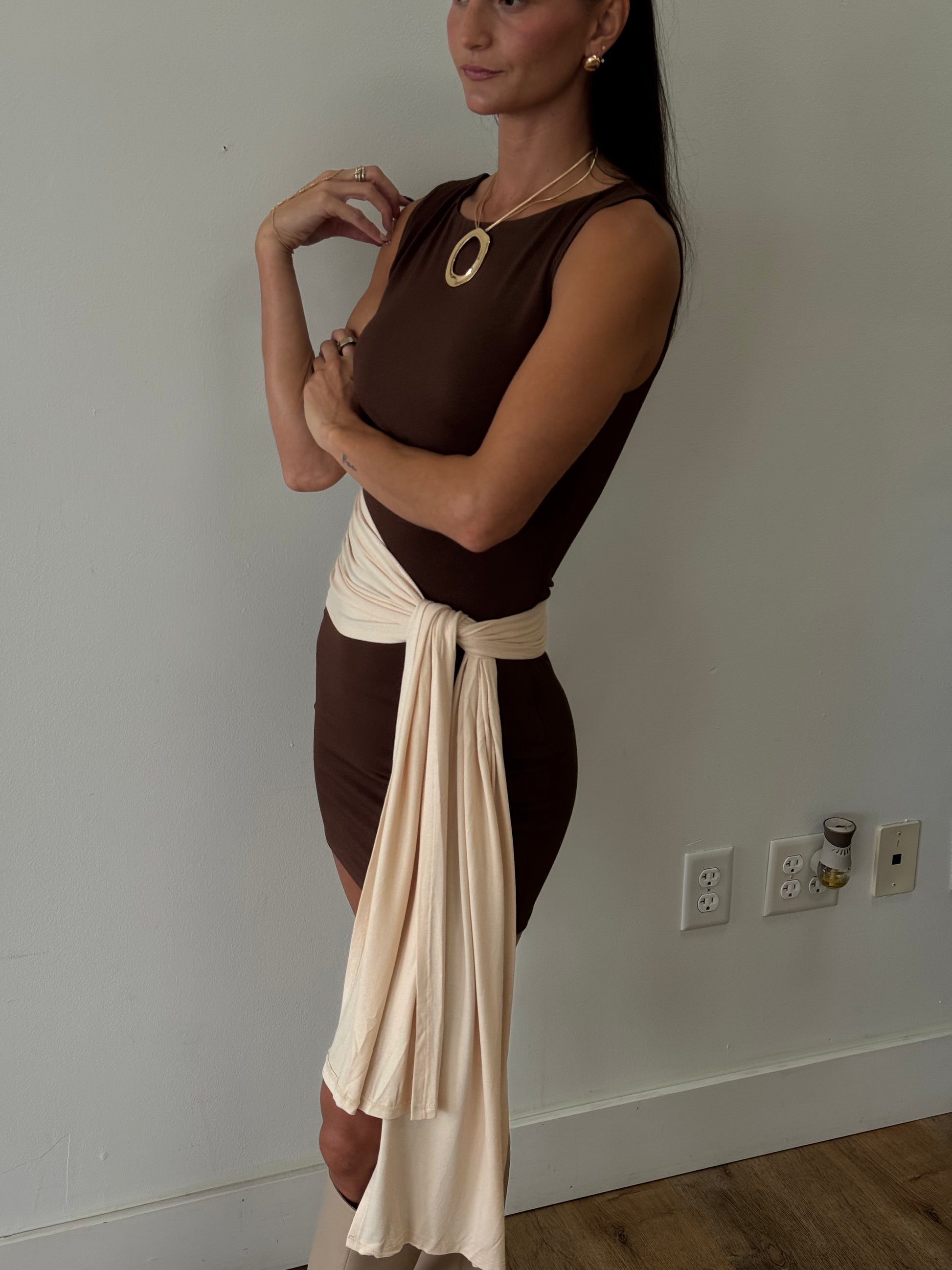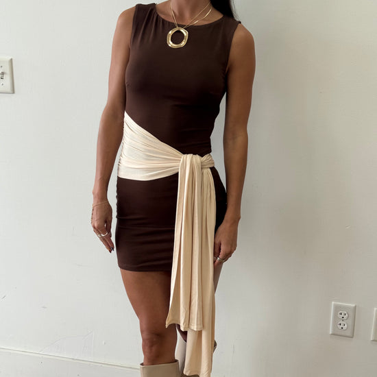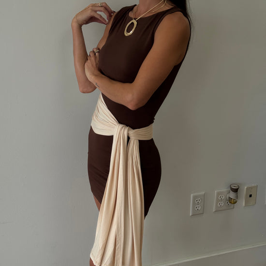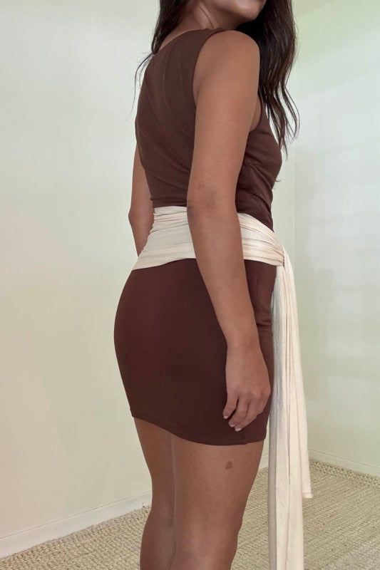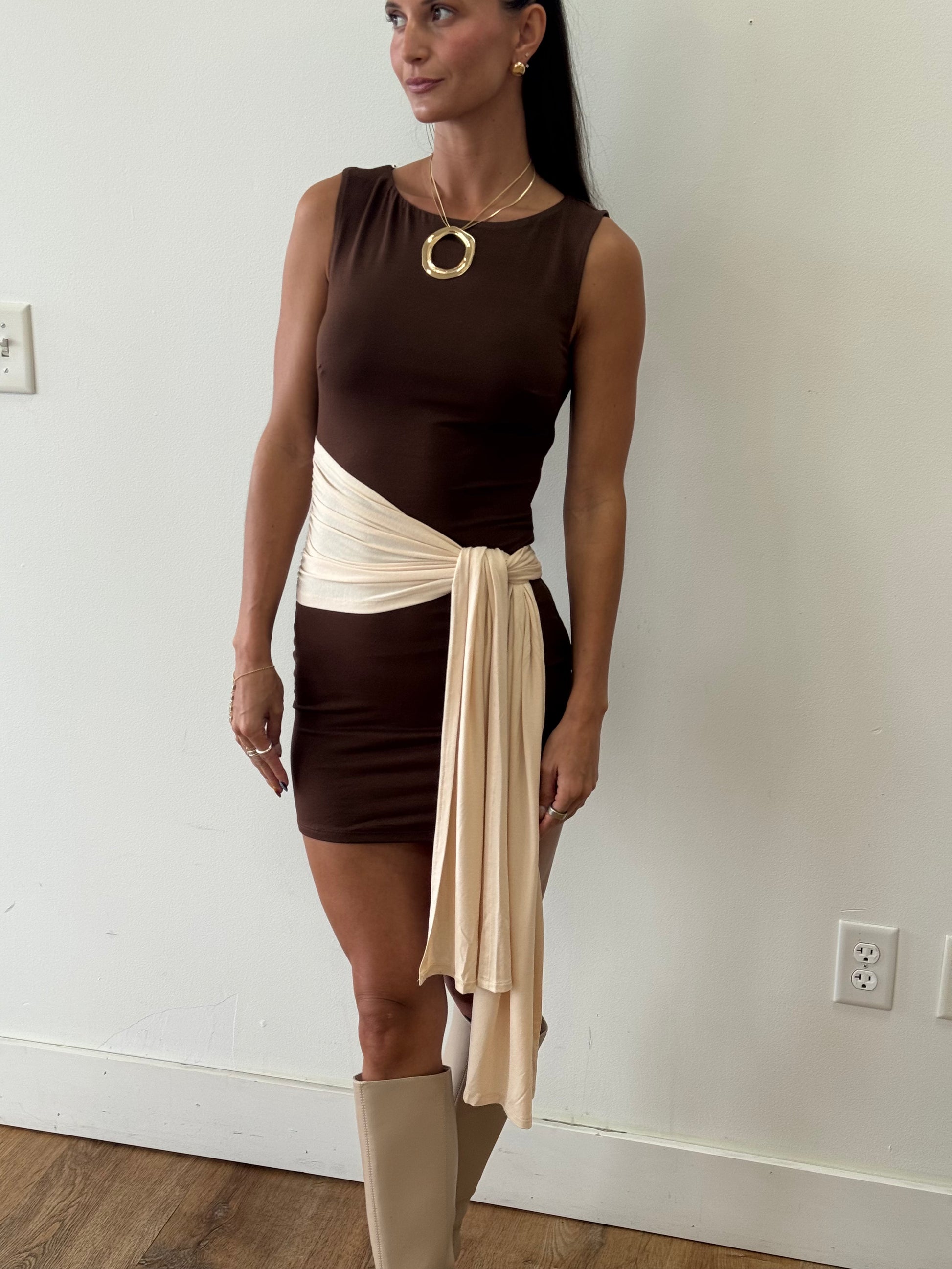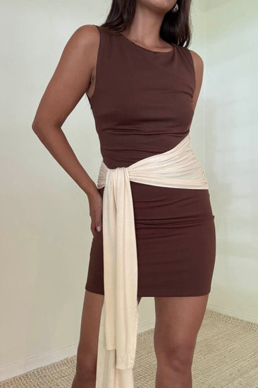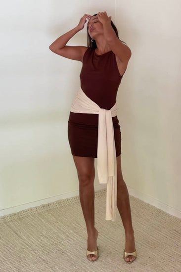 This dress offers a sophisticated silhouette with a contemporary twist. It features an elegant waist wrap that beautifully accentuates your figure while the sleeveless boat neck design adds a refined touch. The side invisible zipper closure ensures a seamless fit.