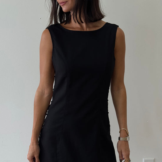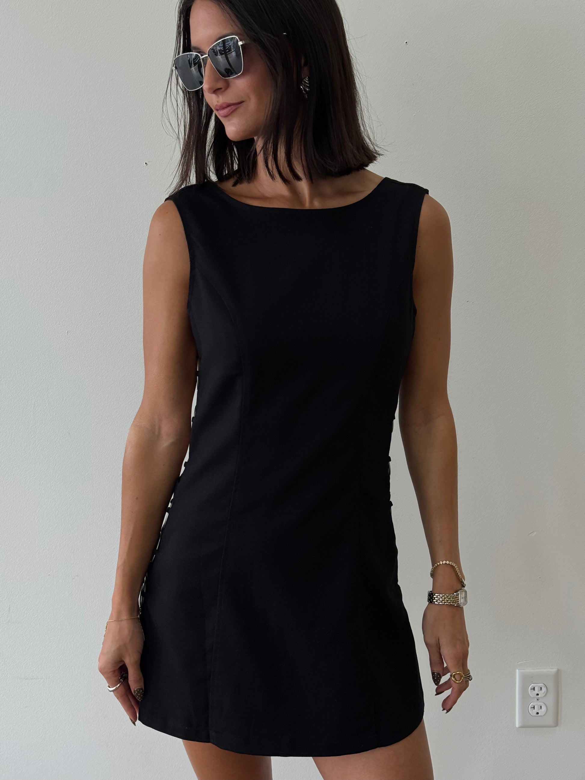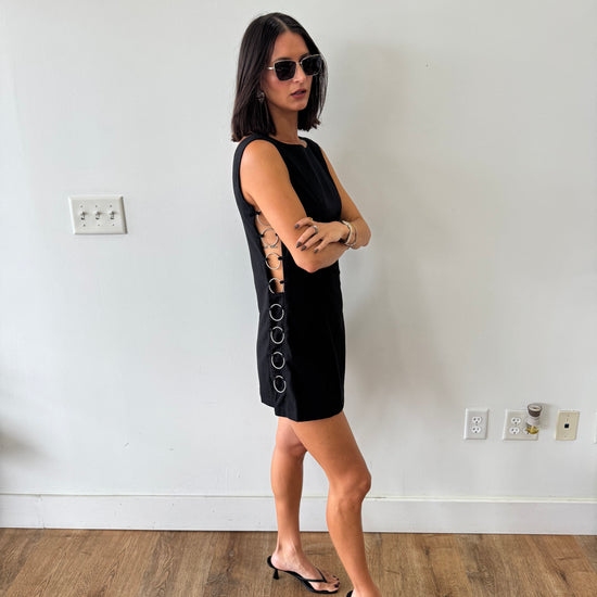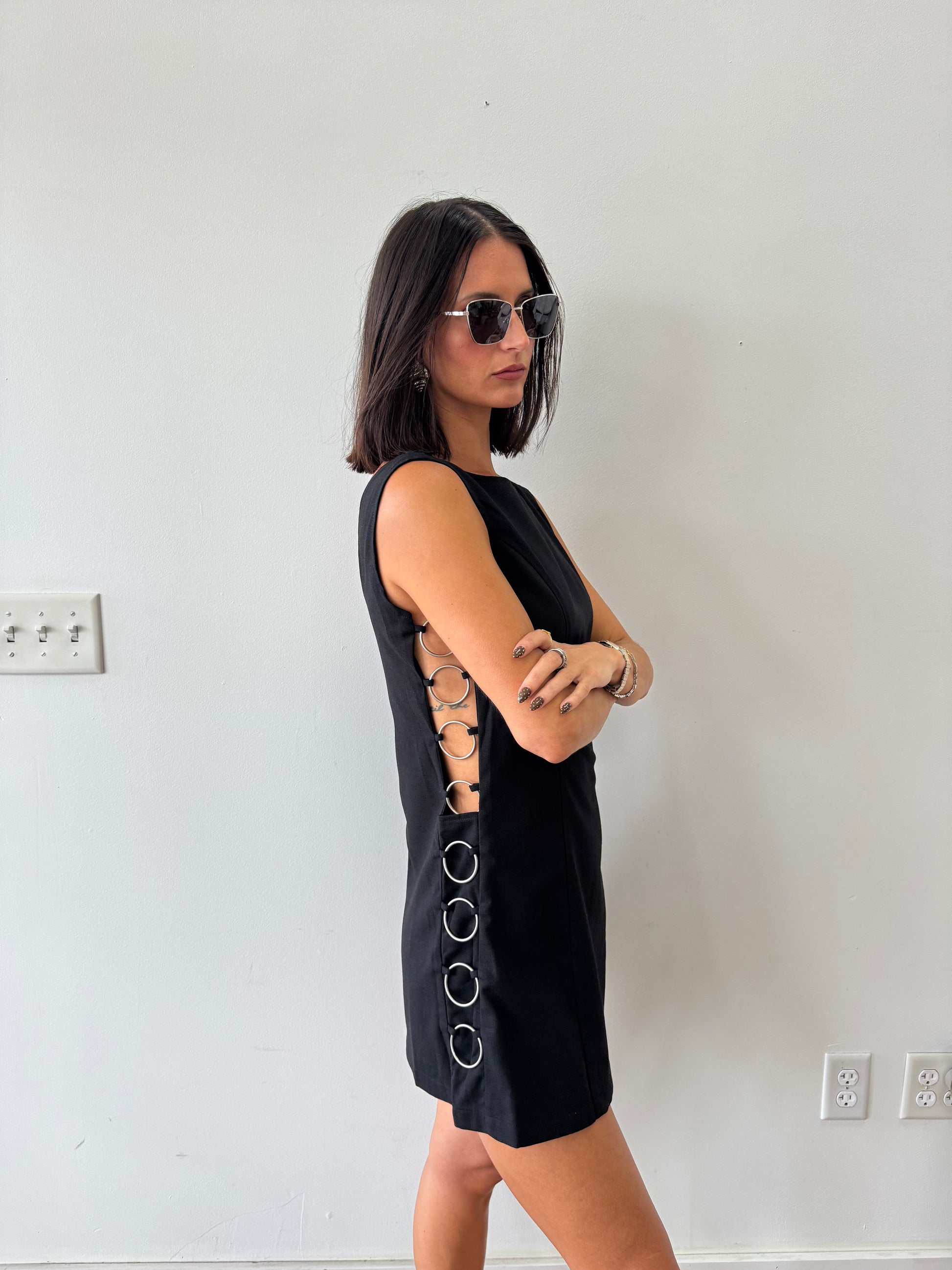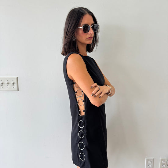 Feel empowered and radiate like a QUEEN with our Vibe Check mini dress! , This striking black mini dress features unique side O-ring metal accents and side cut-outs. It showcases a round neckline, scooped back, and secures with a zipper in the back. Pair it with casual Western-style boots or elevate your look with some heels for a fun night out!