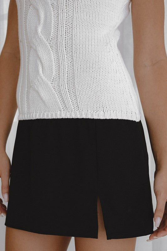 This mini is just the absolute cutest! Mock neck cable sleeveless sweater to drop waist black mini skirt with a flirty slit! side zipper.