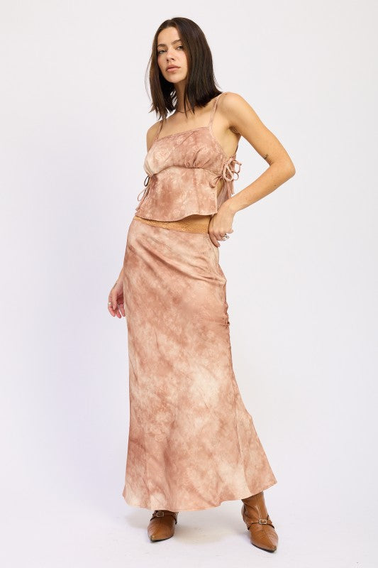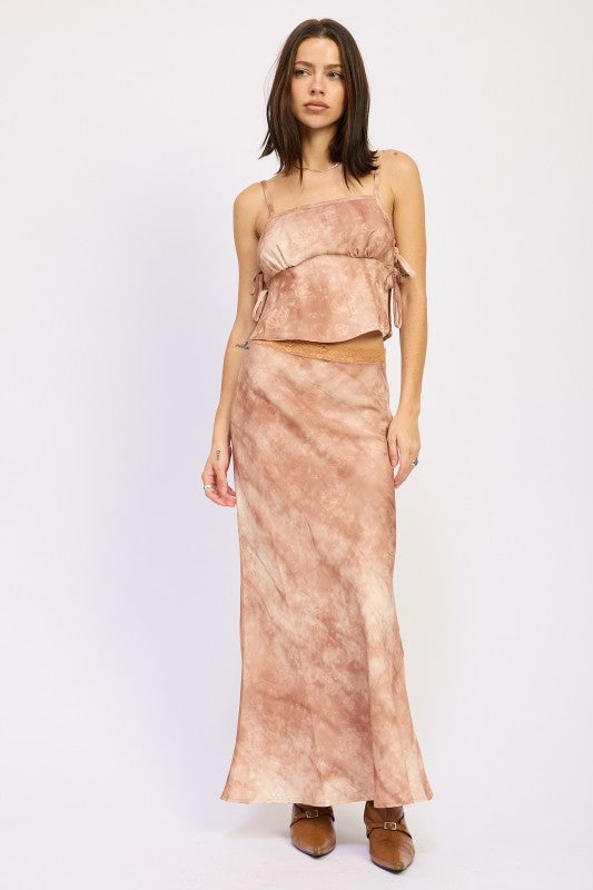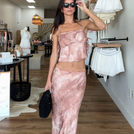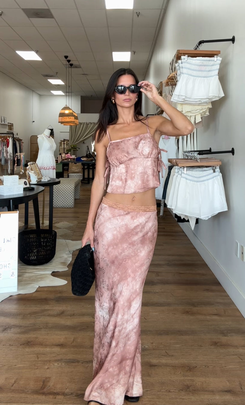 Wear this Wild Rose Tie Crop as a set or separately! Mocha coloring detailed with subtle rose, adjustable straps, side ties and crop length. Wild Rose Maxi Skirt sold separately.